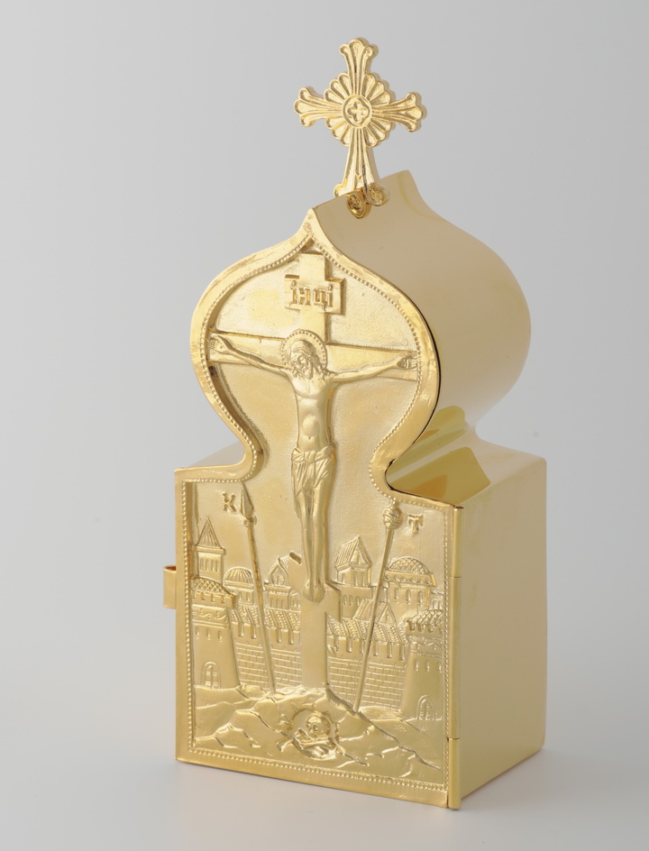 На крышке позолоченной дароносицы изображен Иисус Христос, распятый на Кресте, рядом – копие и трость, а внизу – камни Голгофской горы и Адамова глава. Символически это указывает на то, что Смертью Второго Адама (Христа) была одержана победа над смертью, внесенной в мир первым Адамом.
