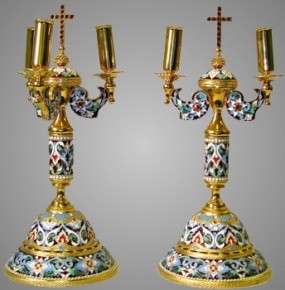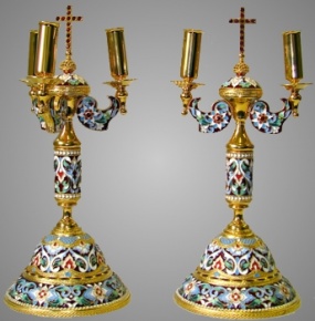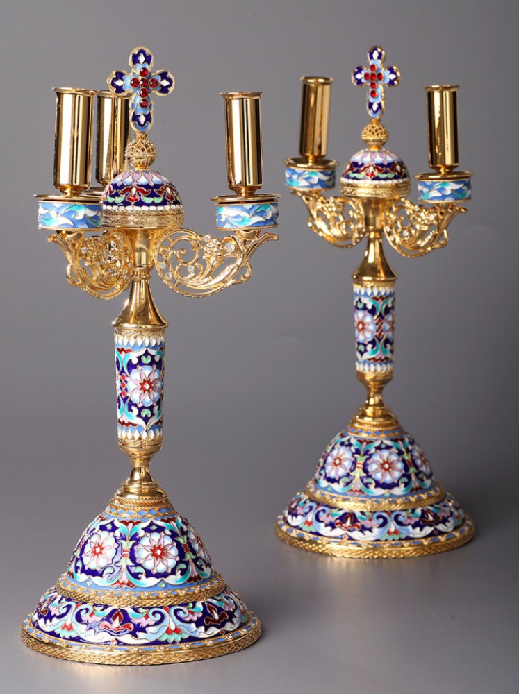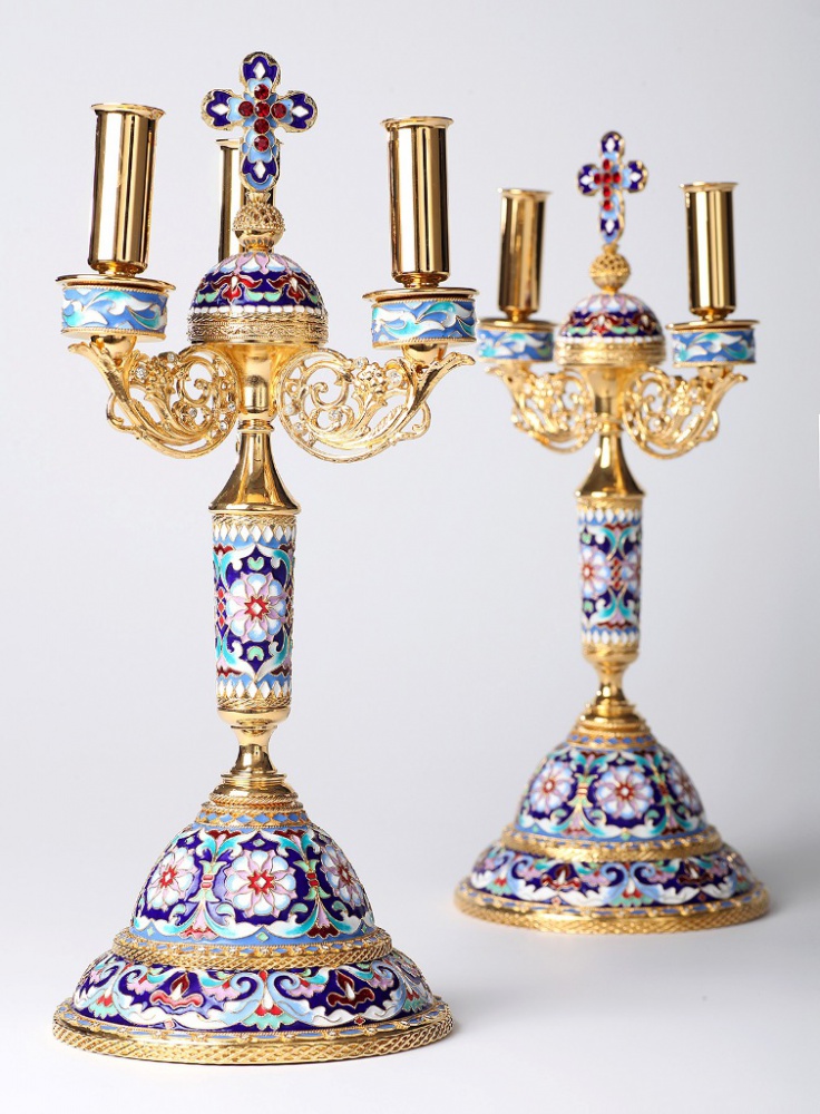 Величественный комплект дикирия-трикирия, украшенный голубой эмалью, подойдет для особенно торжественных богослужений, особенно в дни двунадесятых праздников, посвященных Божией Матери. Тонкая филигрань, насыщенные эмалевые узоры, яркие камни – всё это делает комплект настоящим произведением церковного искусства.