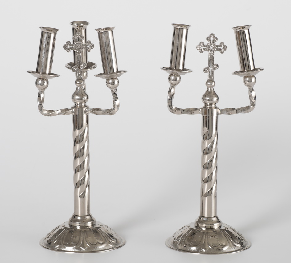 Классический комплект дикирия-трикирия отличается простотой и лаконичностью. Выполненные из латуни и покрытые никелем, изделия украшены восьмиконечными крестами – символом победы Христа над смертью и диаволом. Ручки подсвечников имеют рельефное покрытие, которое существенно уменьшает скольжение и делает использование изделий более удобным.