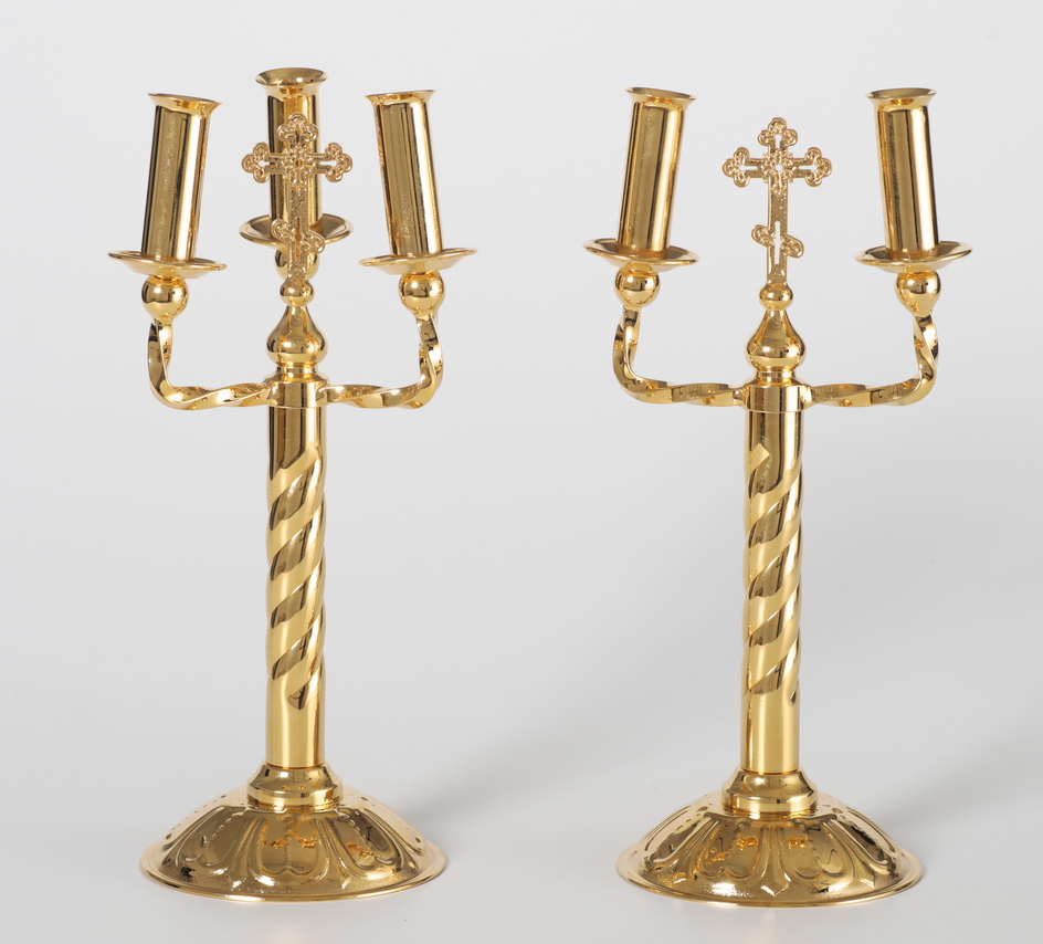 Классический комплект дикирия-трикирия отличается простотой и лаконичностью. Выполненные из латуни и покрытые позолотой, изделия украшены восьмиконечными крестами – символом победы Христа над смертью и диаволом. Ручки подсвечников имеют рельефное покрытие, которое существенно уменьшает скольжение и делает использование изделий более удобным.