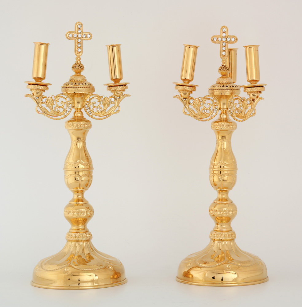 Благородный комплект дикирия-трикирия не имеет лишних деталей. Основание подсвечников украшено мелкими литыми узорами, а центр композиции – четырехконечный крест – выделен белыми камнями, похожими на бриллианты.