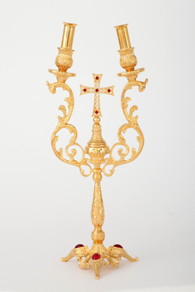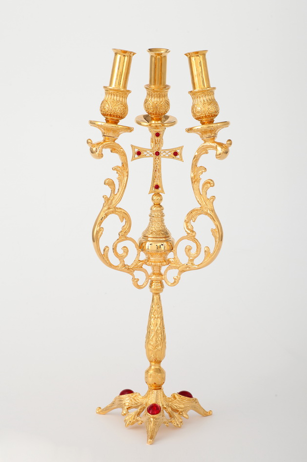 Воздушный комплект дикирия-трикирия выполнен из латуни и покрыт позолотой. Тонкие металлические ветви, выполненные в технике литья, высоко приподнимают свечи, создавая ощущение невесомости. Основание ножки и крест украшены яркими камнями.