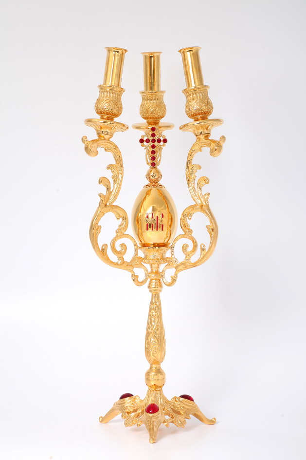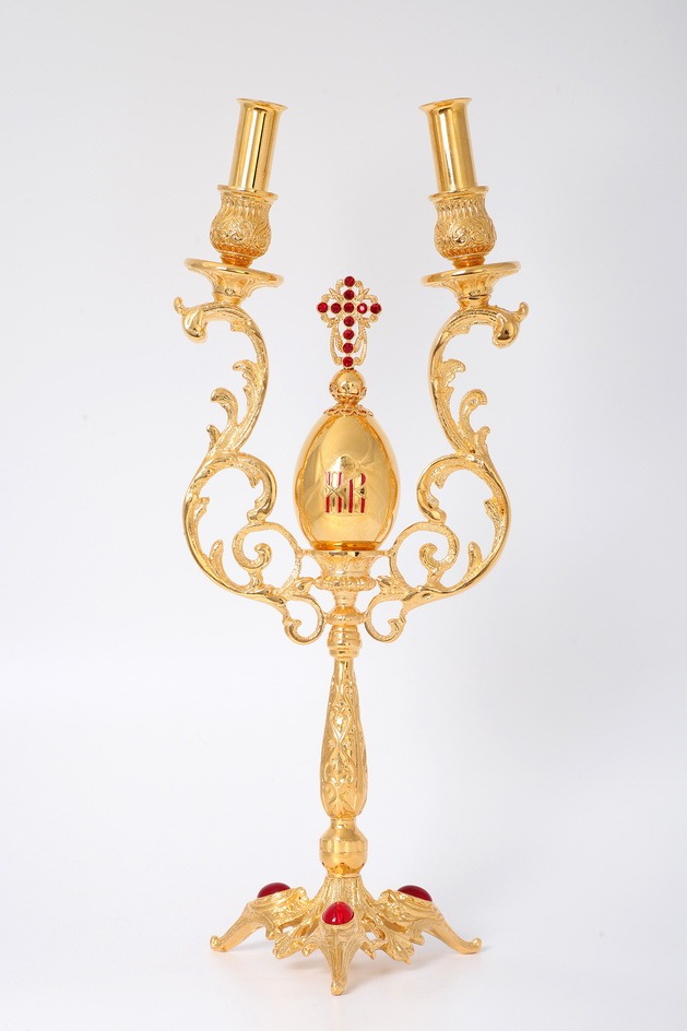 Пасхальный комплект дикирия-трикирия украшен золотыми яйцами с глубоко символическими для каждого христианина буквами «ХВ», которые расшифровываются как «Христос Воскресе». Выполненные из латуни и покрытые позолотой, изделия украшены яркими камнями и эмалью.