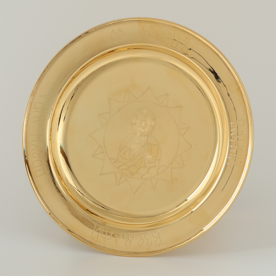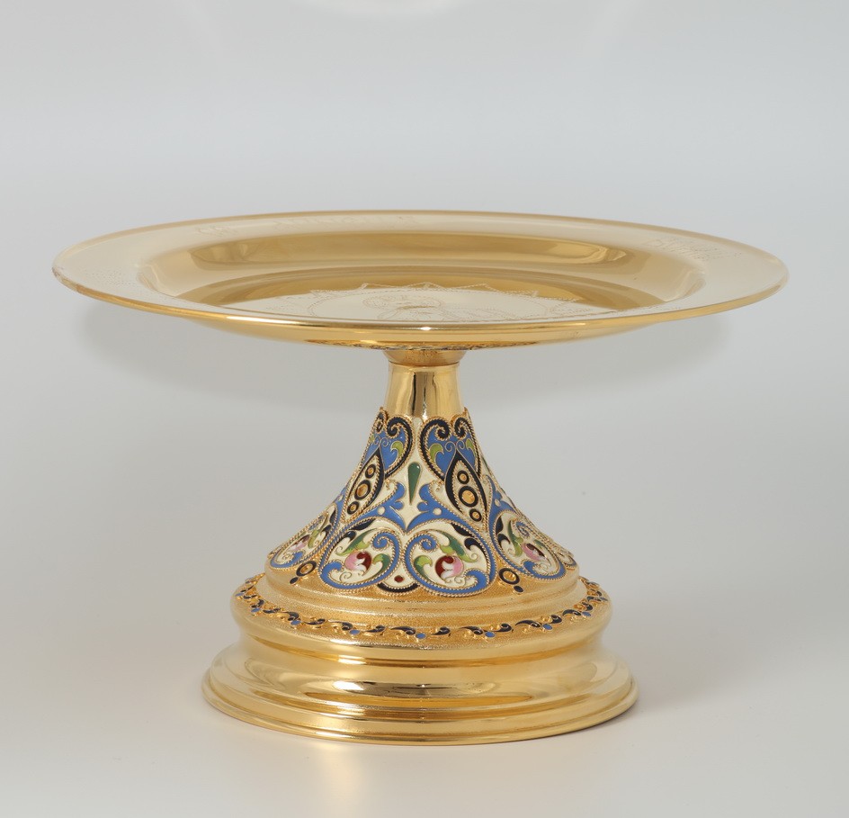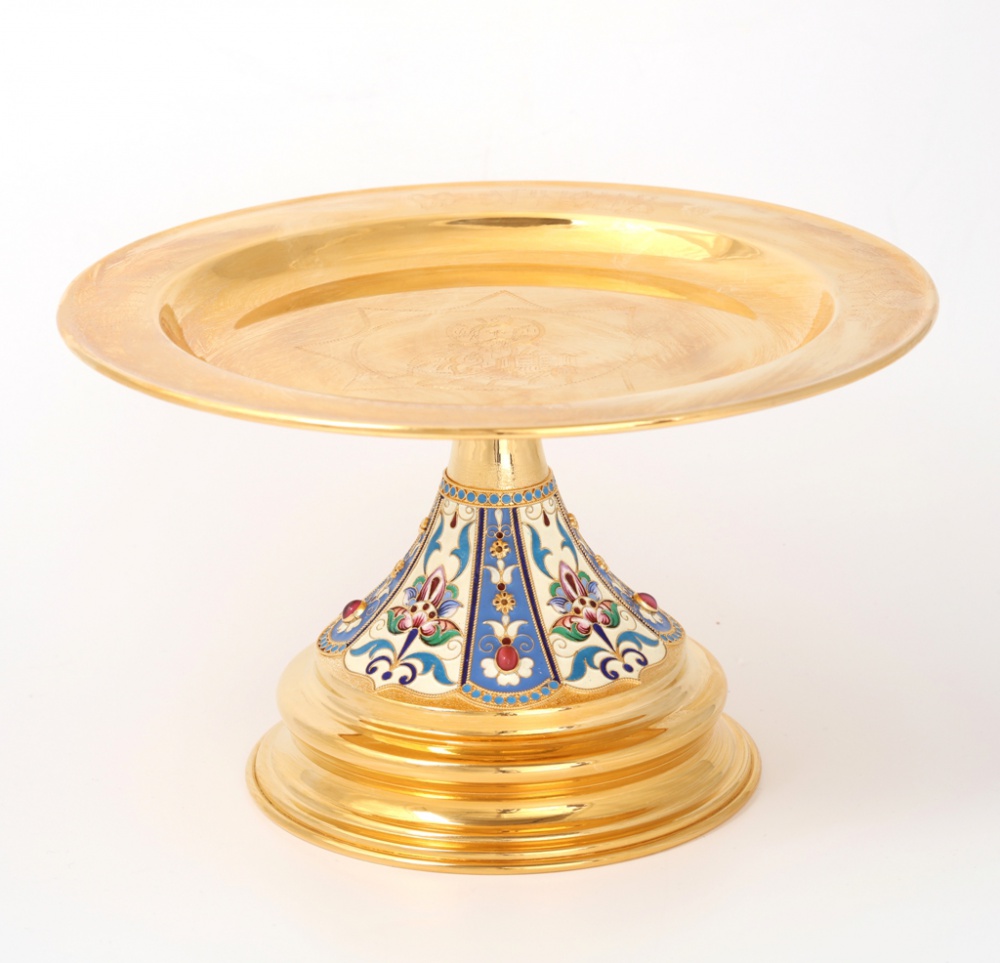 Конусообразная ножка нарядного дискоса обвита золотым филигранным кружевом, раскрашена насыщенной эмалью, украшена объемными сияющими камнями. Размер дискоса составляет 240х240х150 мм, а вес – 0,7 кг.