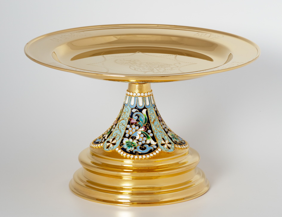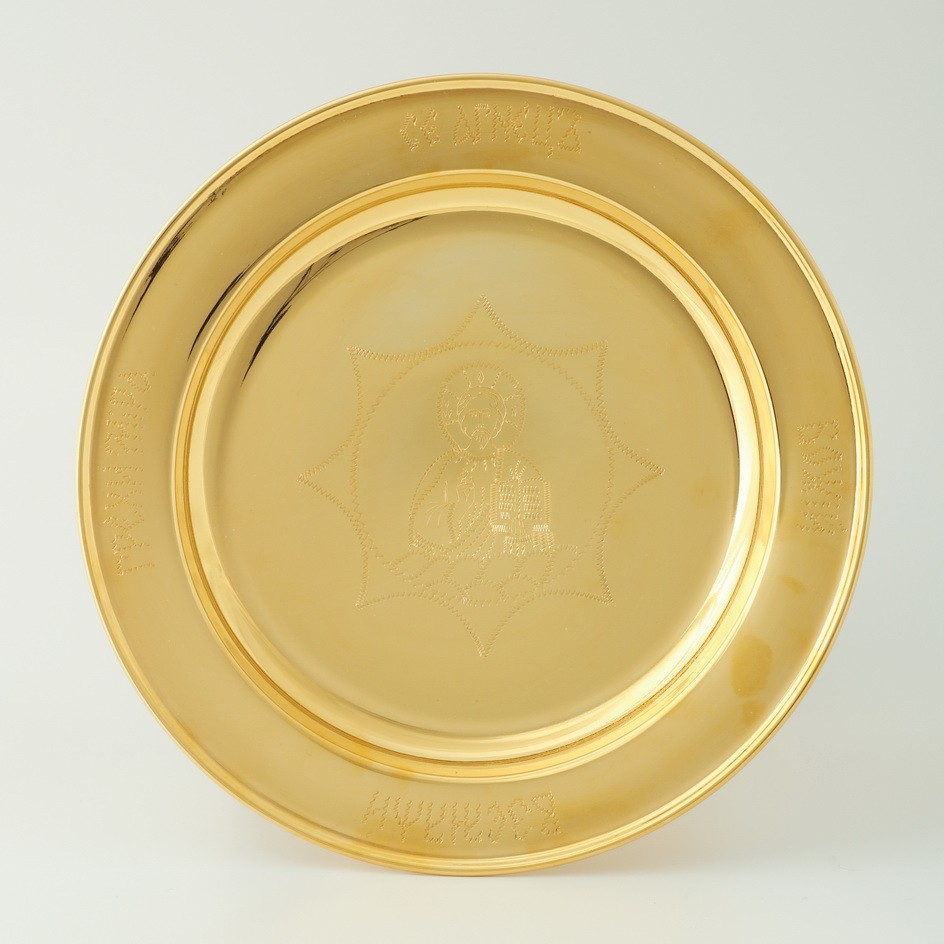Изящный дискос габаритами 240х150х150 мм изготовлен из меди и латуни. Блюдо минималистично украшено иконой Христа и евангельскими словами: «Се Агнец Божий вземляй грехи мира». Ножка дискоса обвита растительными эмалевыми узорами, которые контрастно и благородно смотрятся на золотом фоне.