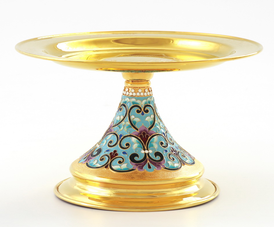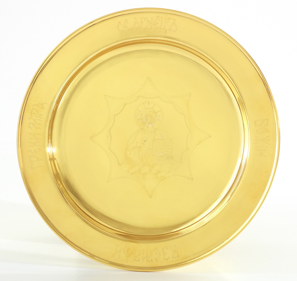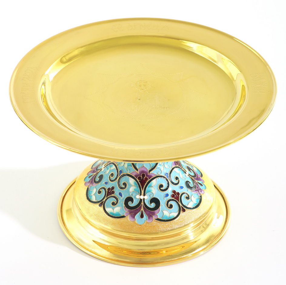 Позолоченный дискос изготовлен из меди и латуни. На блюдо методом ручной гравировки нанесена поясная икона Господа Вседержителя и слова: «Се Агнец Божий вземляй грехи мира». Ножка дискоса обвита тонкими филигранными узорами, которые раскрашены эмалью. Размер дискоса составляет 240х240х120 мм, а вес – 0,432 кг.