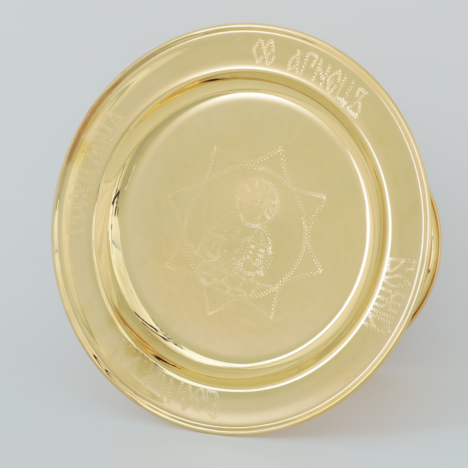 Массивная и устойчивая ножка праздничного позолоченного дискоса украшена объемными геометрическими орнаментами, выполненными методом гальванопластики. В центре блюда изображена икона Господа Вседержителя с Евангелием в руках. По краю дискоса методом ручной гравировки написаны слова: «Се Агнец Божий вземляй грехи мира» (Ин. 1:29).