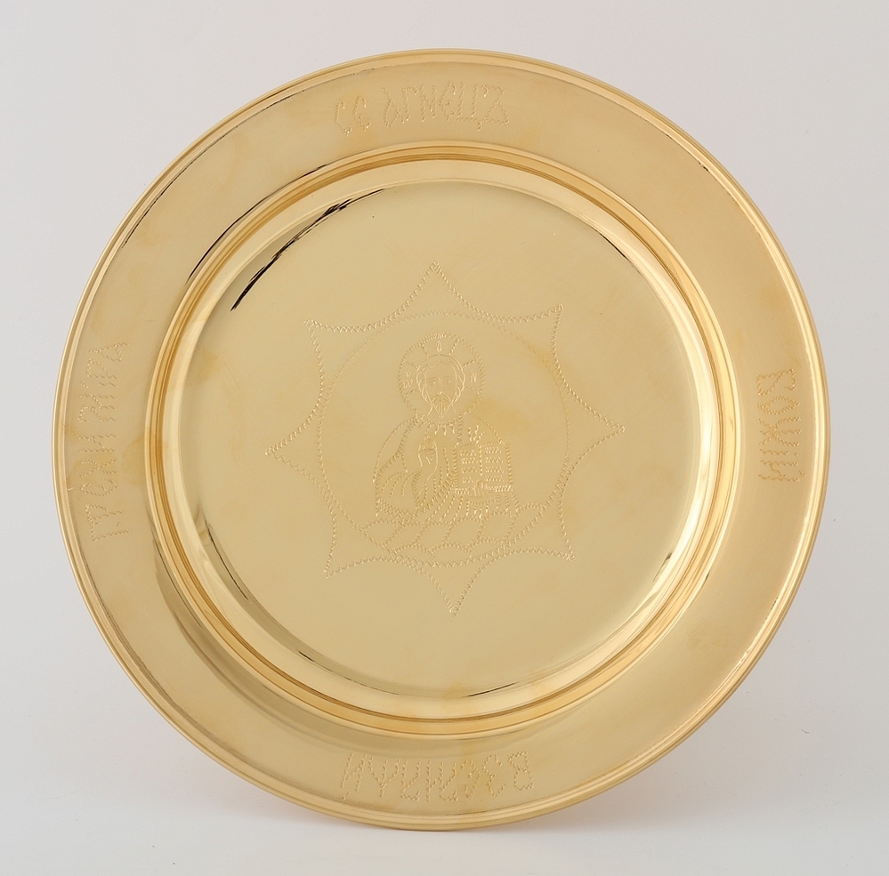 Торжественный дискос, изготовленный из меди и латуни, станет настоящим украшением богослужения. Широкая ножка потира обвита золотым филигранными кружевом. Яркие эмалевые цветы бордовых оттенков чередуются с выпуклыми камнями, похожими на рубины. Вес изделия составляет 0,432 кг.