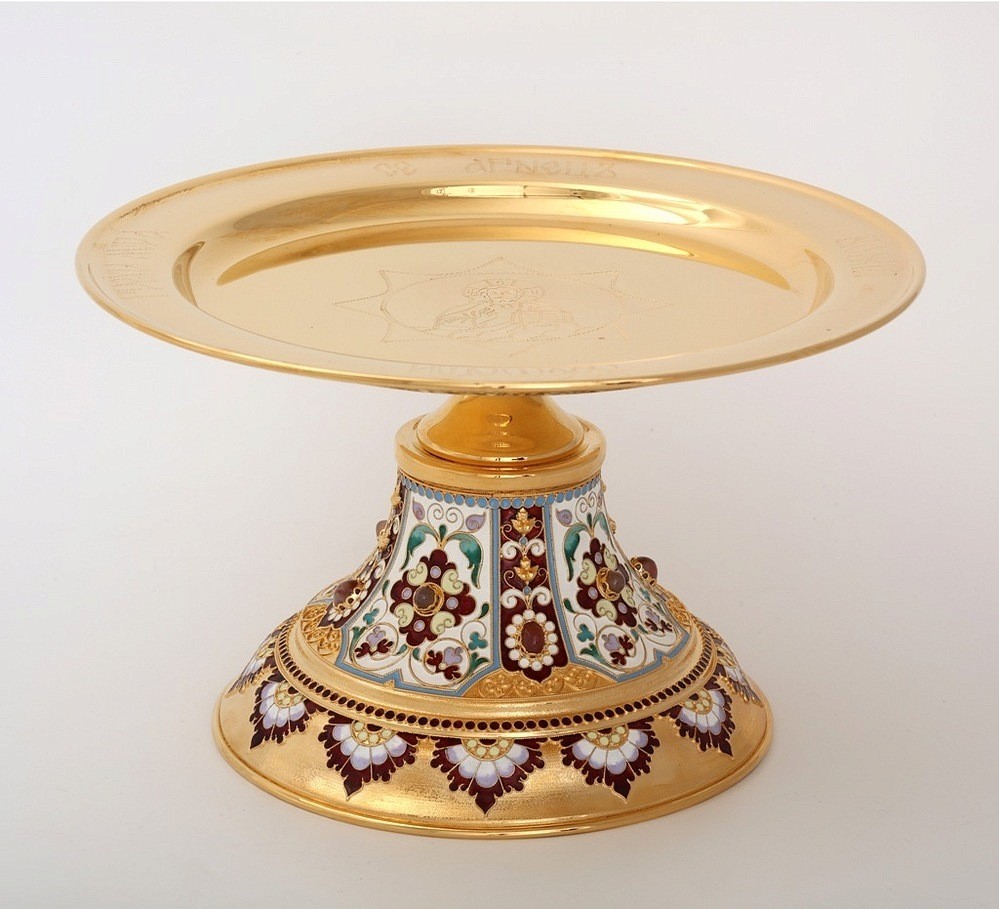 Царственный дискос на богато украшенной ножке выполнен из латуни и меди. На тонкое блюдо методом ручной гравировки нанесена восьмиконечная звезда, внутри которой изображен Христос, держащий в руках Евангелие. На кайме блюда написаны слова, объясняющие символику Агнца, который будет положен на дискос: «Се Агнец Божий вземляй грехи мира». Ножка дискоса обвита тонкими филигранными кружевами, раскрашенными яркой эмалью и украшенными объемными камнями, переливающимися при свете ламп и свечей.