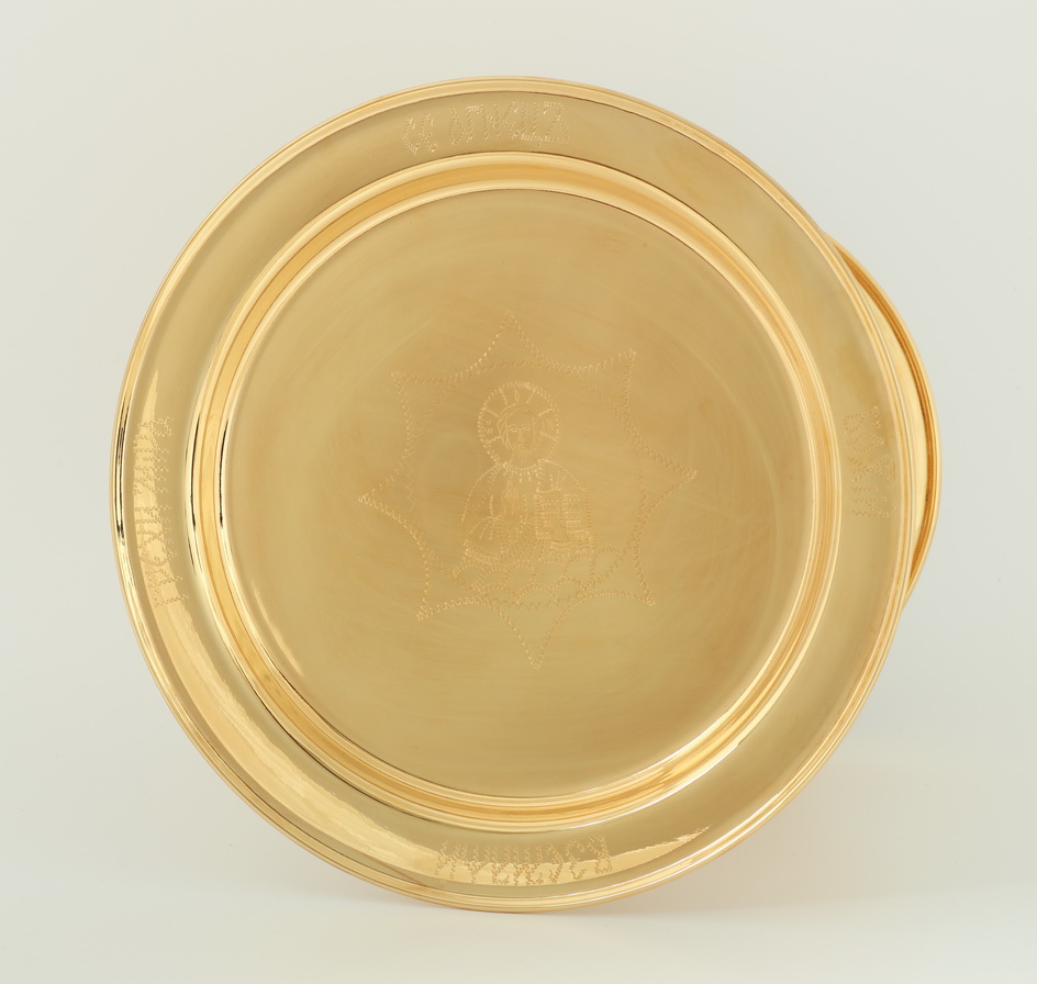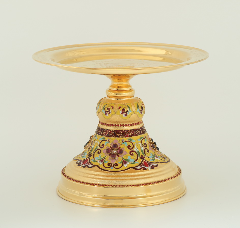 Позолоченный дискос на высокой богато украшенной ножке выполнен из латуни и меди. На тонкое блюдо методом ручной гравировки нанесена икона Господа Вседержителя, держащего в руках Евангелие и благословляющего молящихся. На кайме блюда написаны слова, объясняющие символику Агнца, который будет положен на дискос: «Се Агнец Божий вземляй грехи мира». Ножка дискоса украшена тонкими филигранными орнаментами, раскрашенными эмалью.