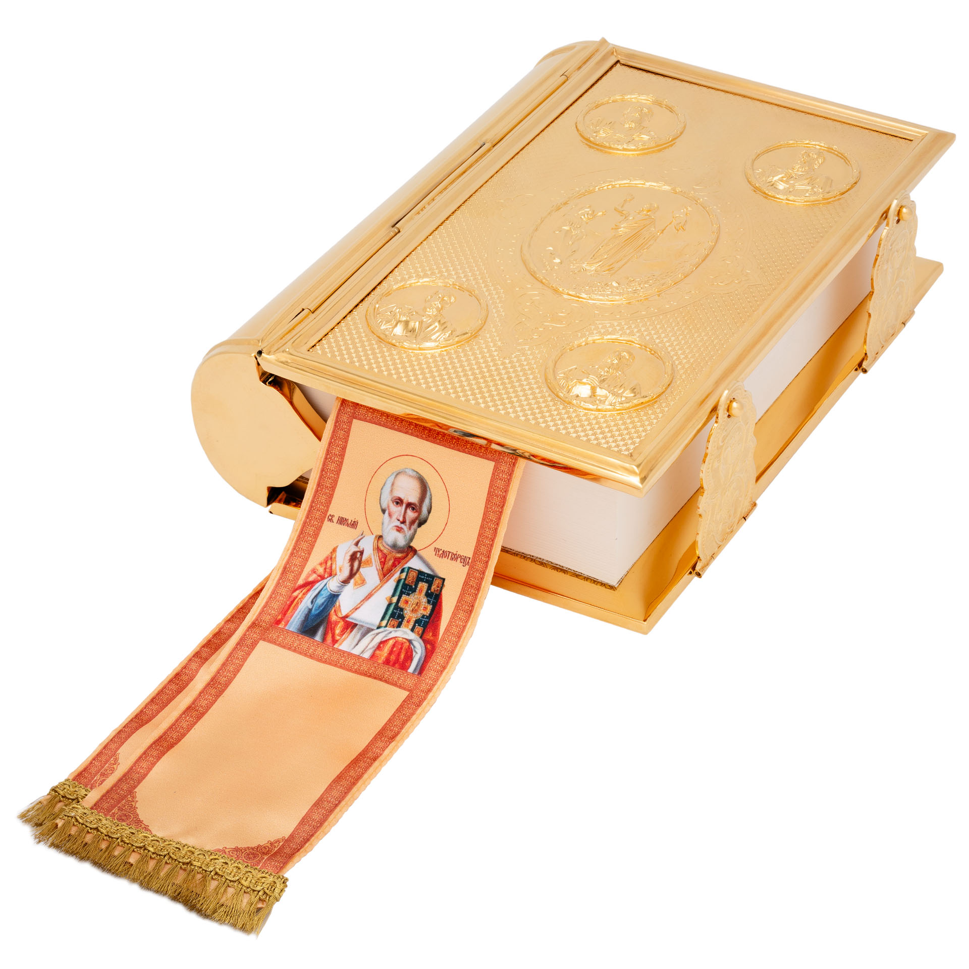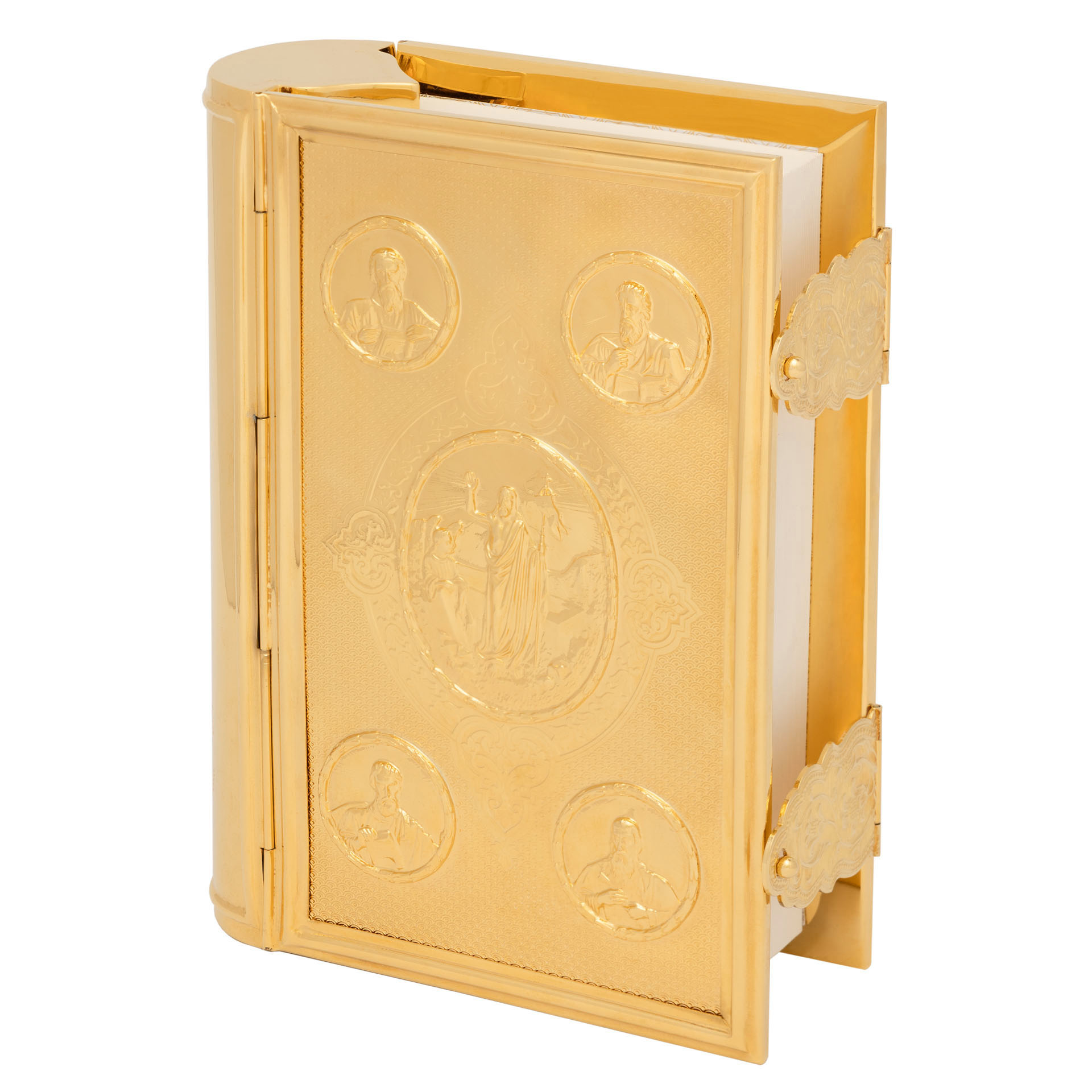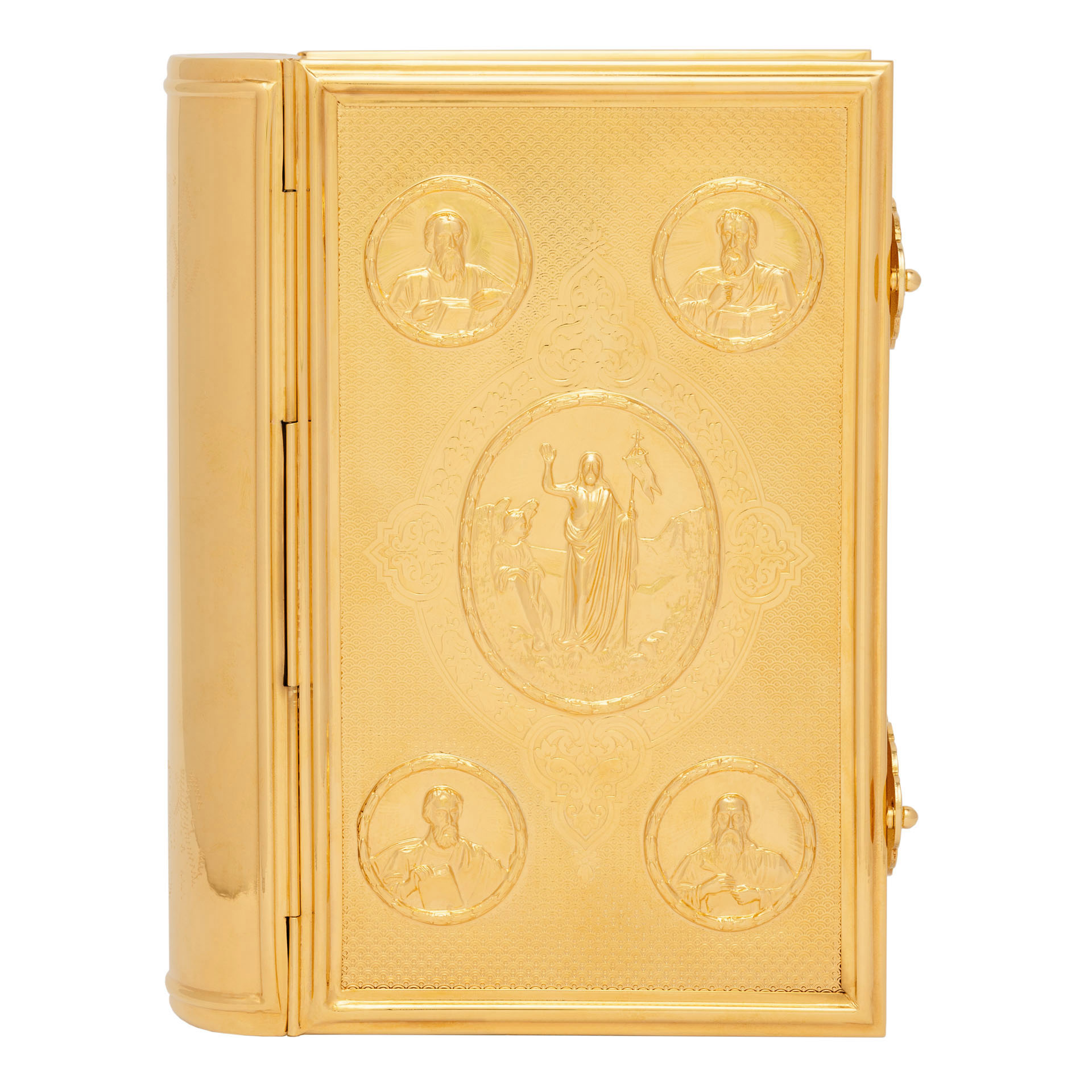 Текст Евангелия отпечатан в типографии ООО "ХПП" СОФРИНО"РПЦ" на церковно-славянском языке с указанием зачал. Данная книга дополняется закладкой из церковной ткани.