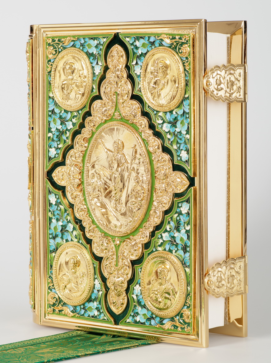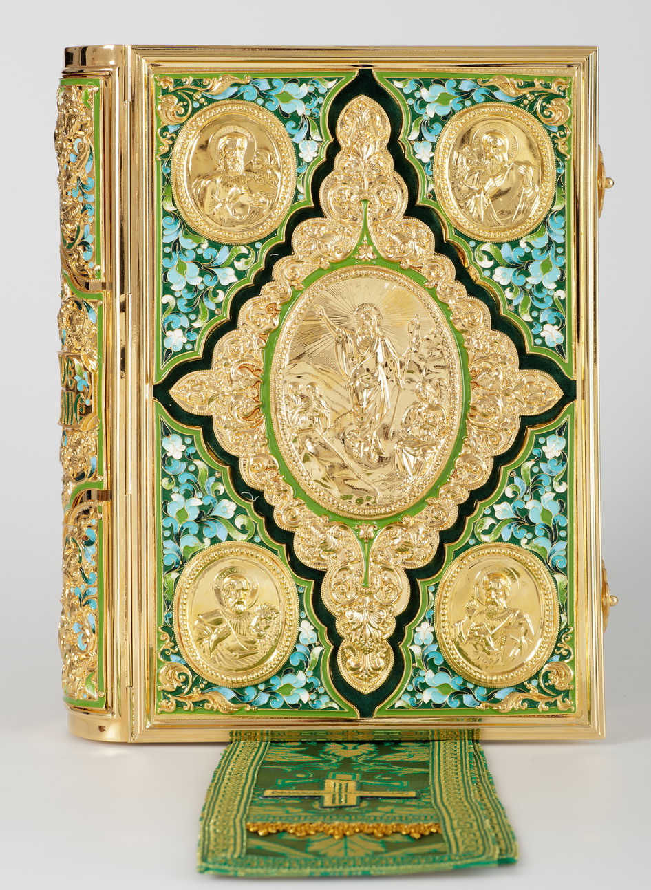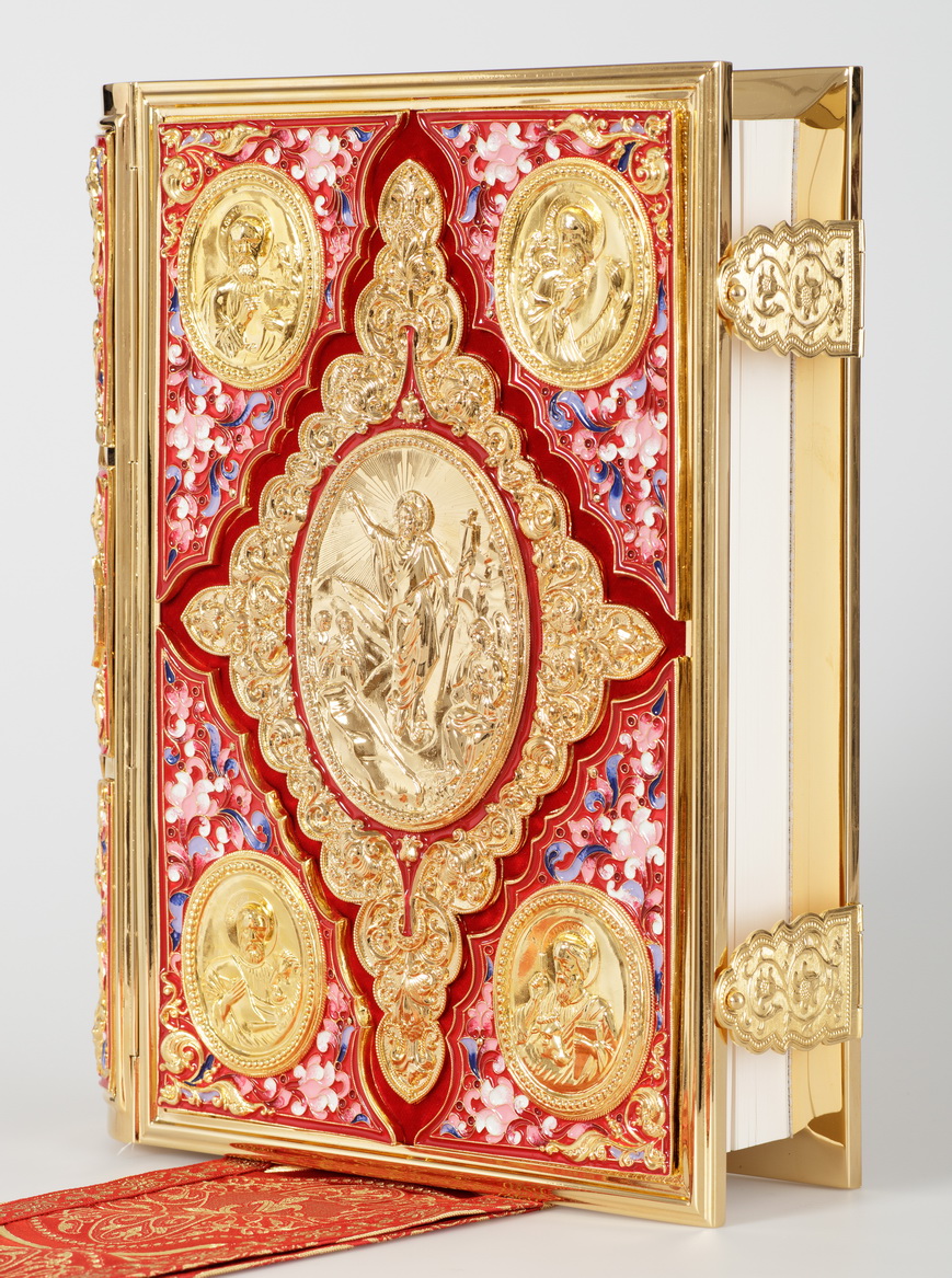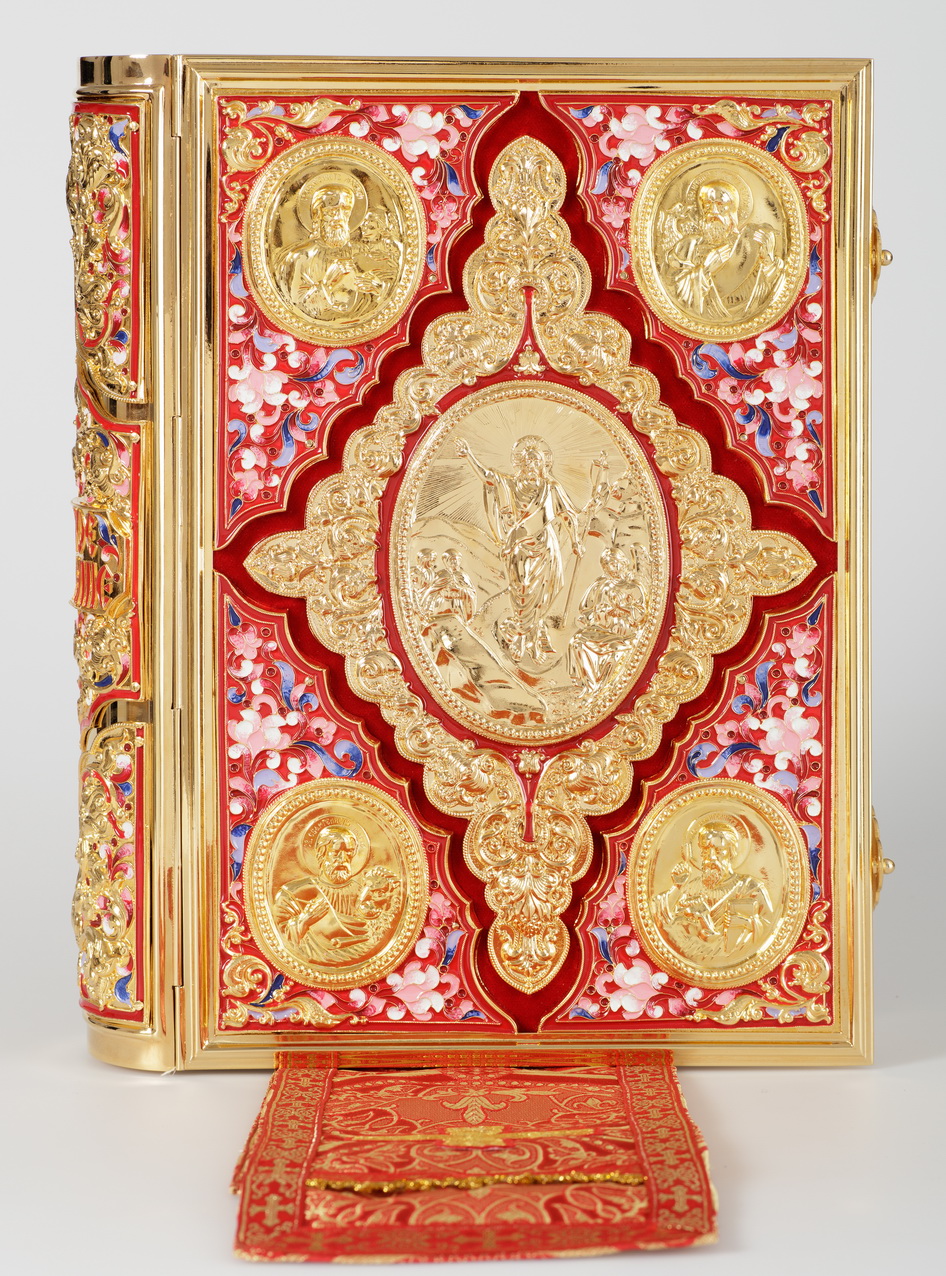 Текст Евангелия отпечатан в типографии ООО "ХПП" СОФРИНО"РПЦ" на церковно-славянском языке с указанием зачал. Данная книга дополняется закладкой из церковной ткани.
