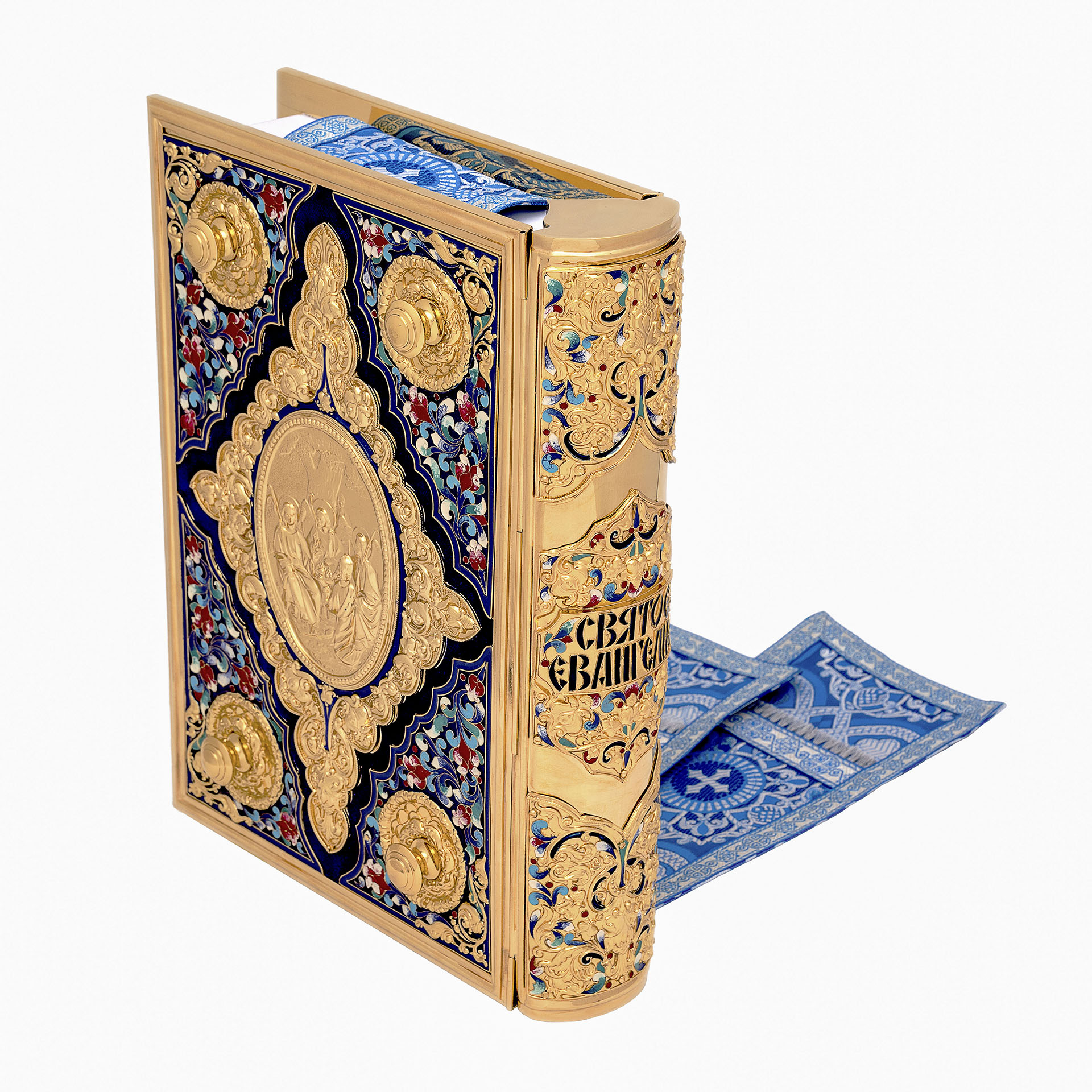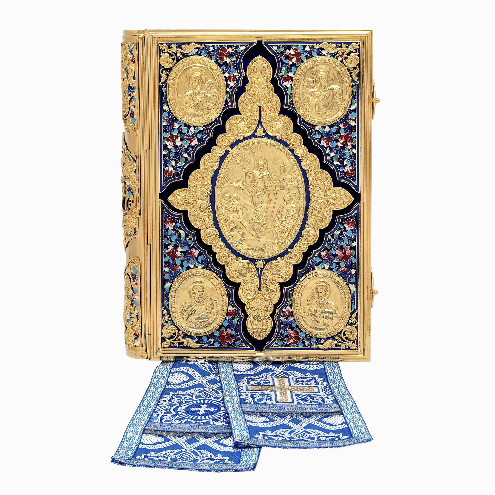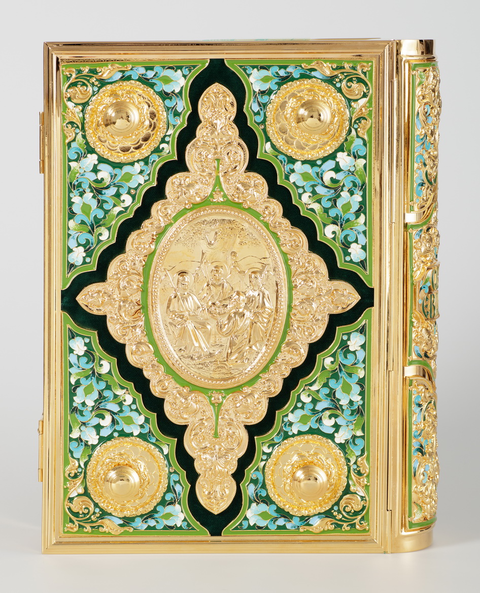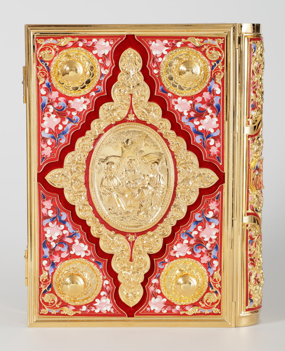 Текст Евангелия отпечатан в типографии ООО "ХПП" СОФРИНО"РПЦ" на церковно-славянском языке с указанием зачал. Данная книга дополняется закладкой из церковной ткани.