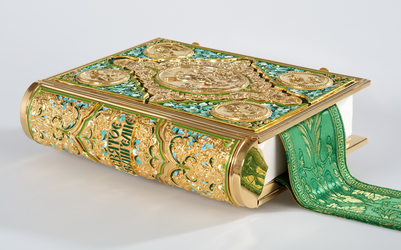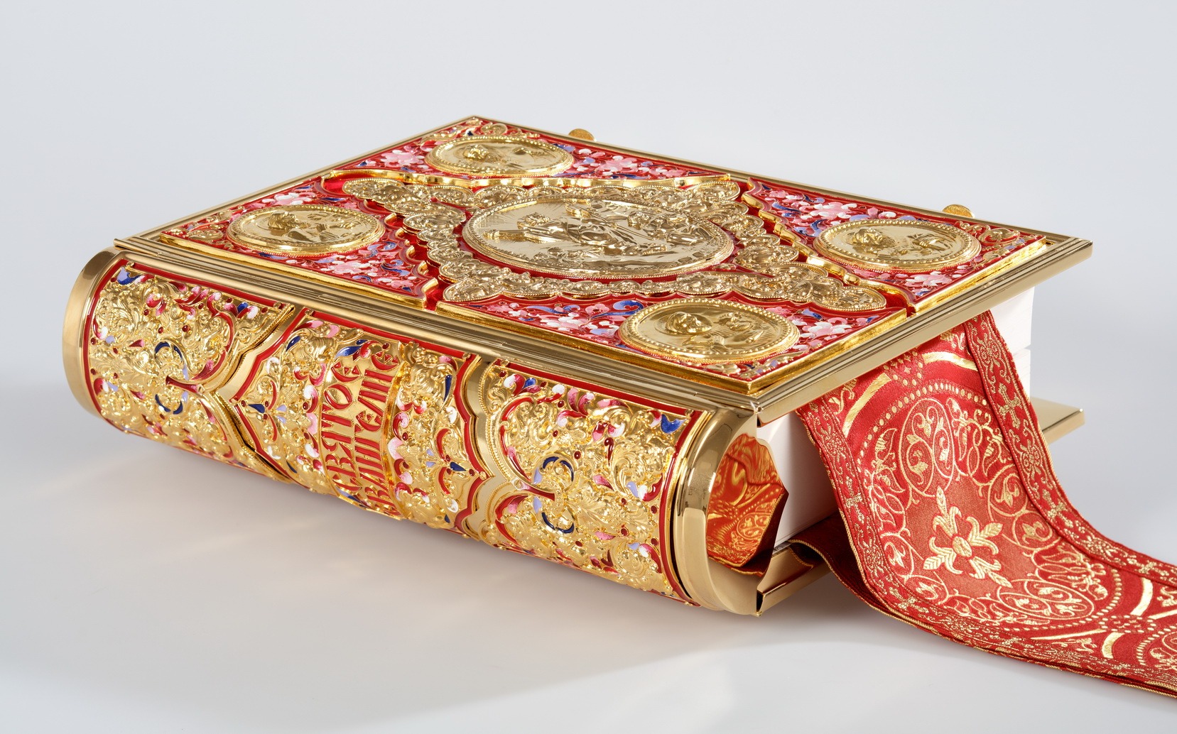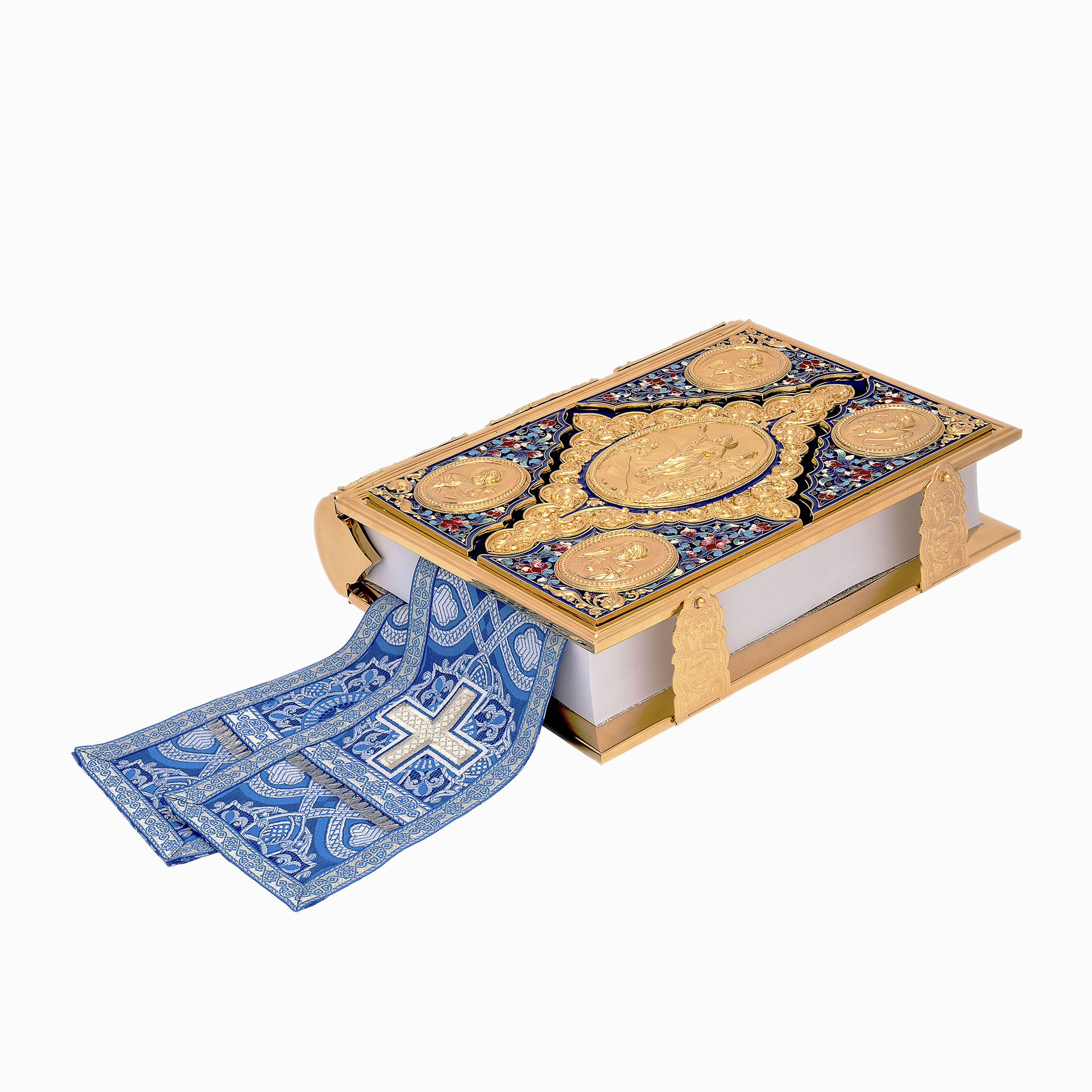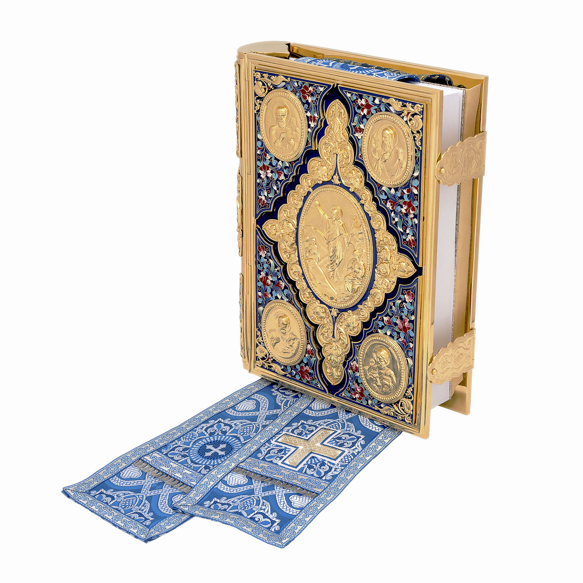Текст Евангелия отпечатан в типографии ООО "ХПП" СОФРИНО"РПЦ" на церковно-славянском языке с указанием зачал. Данная книга дополняется закладкой из церковной ткани.