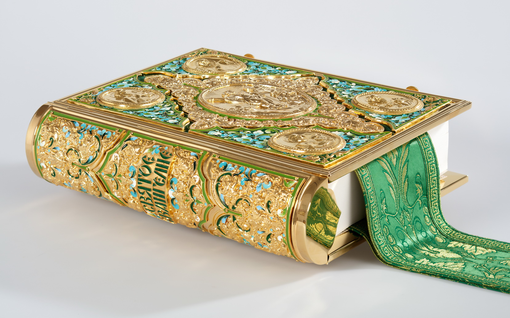 Евангелие 360*240 напрестольное №2 накладки золочение эмаль (с закладкой) зеленый {{variant.name}}