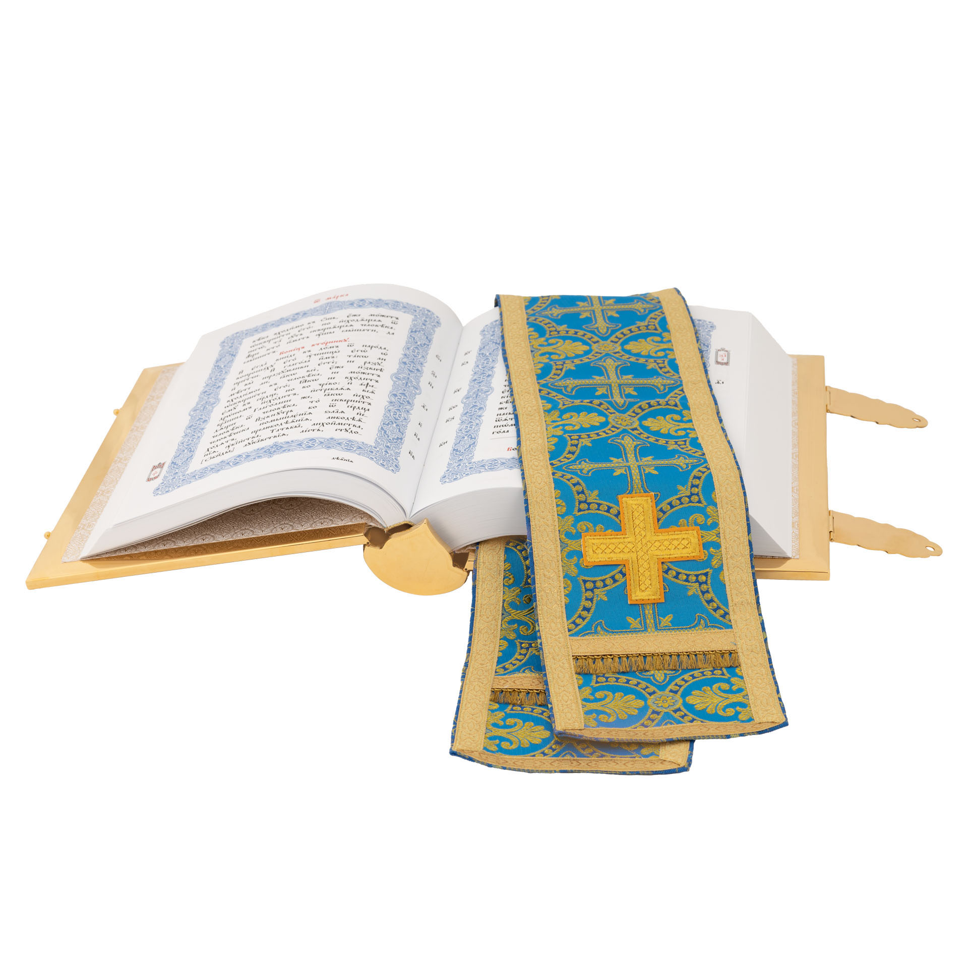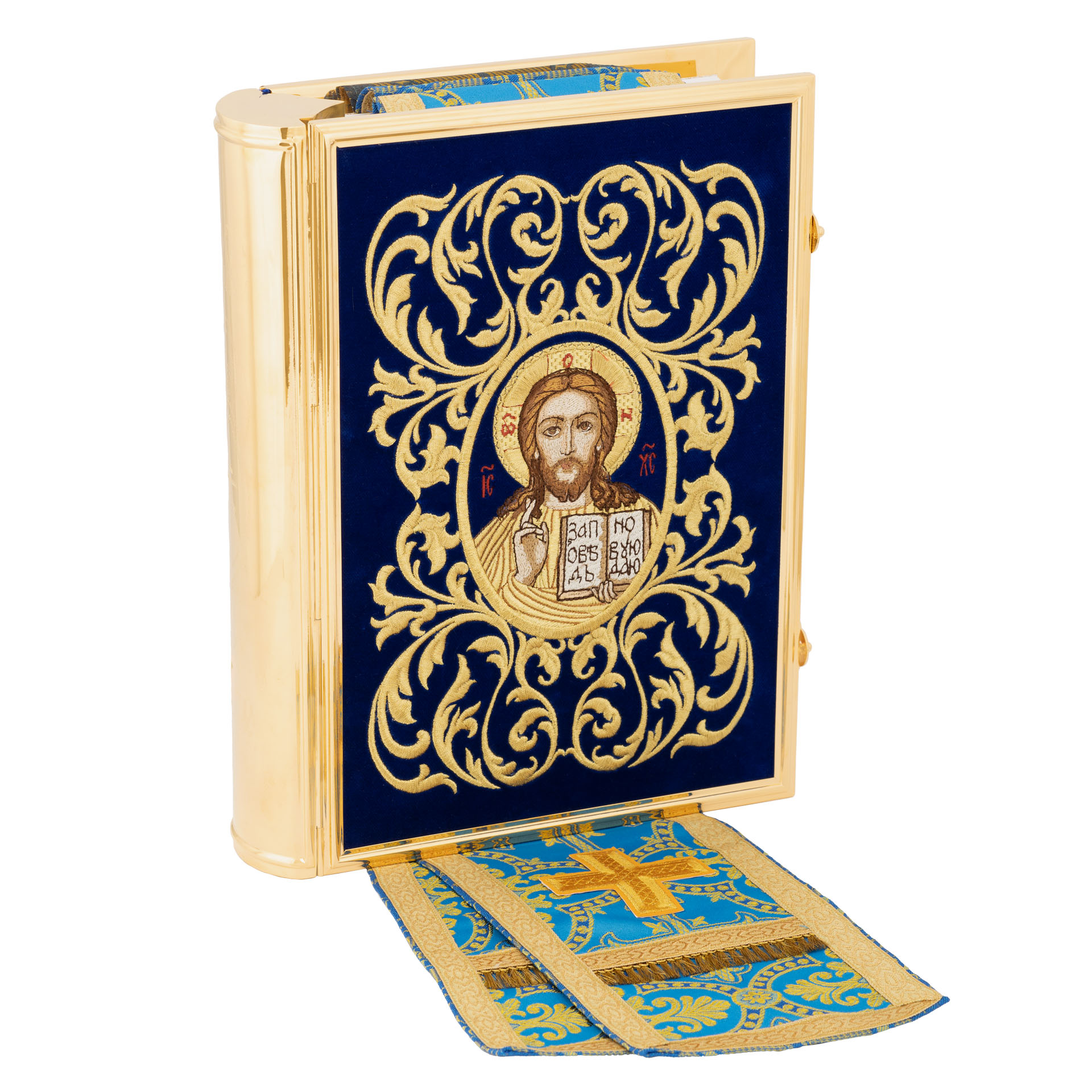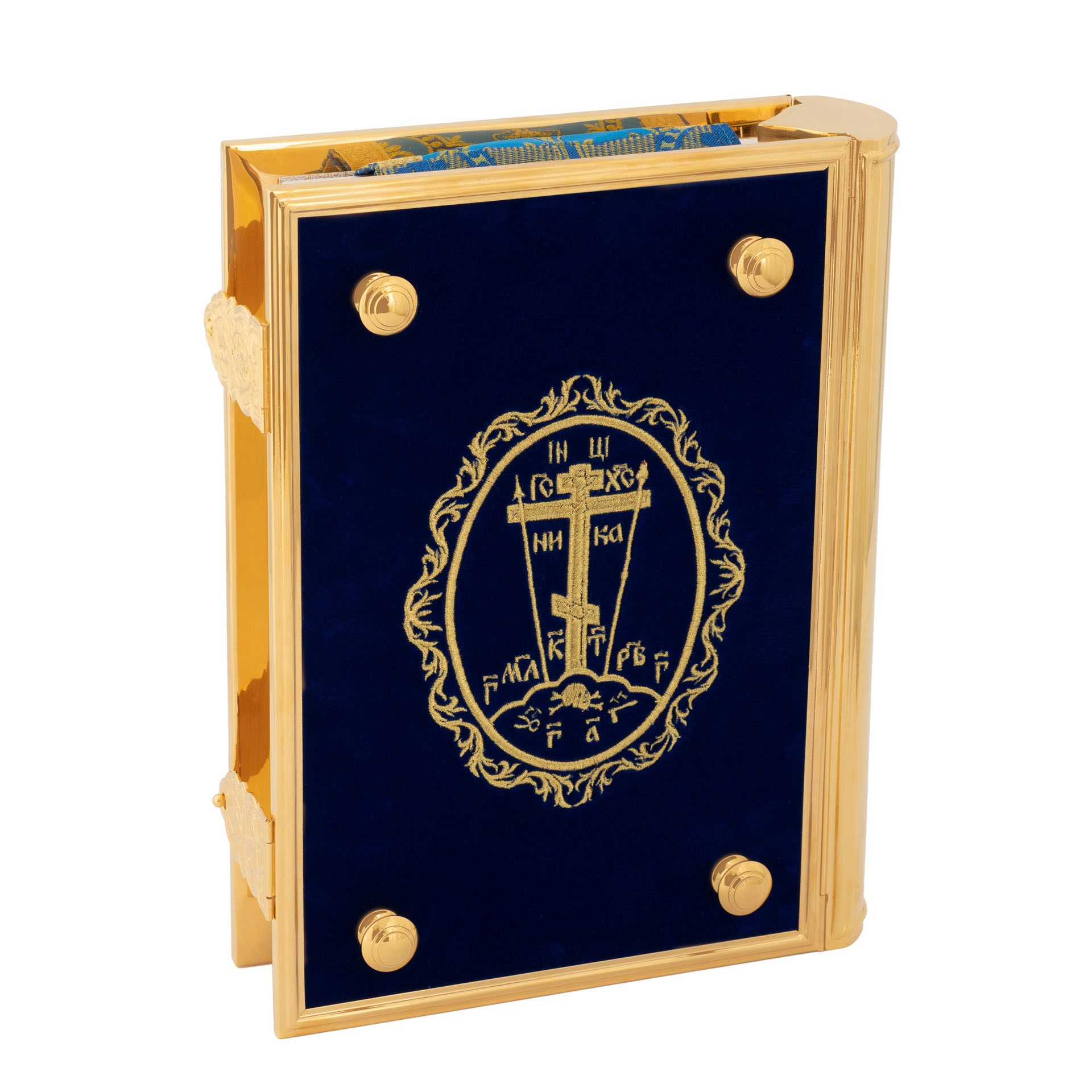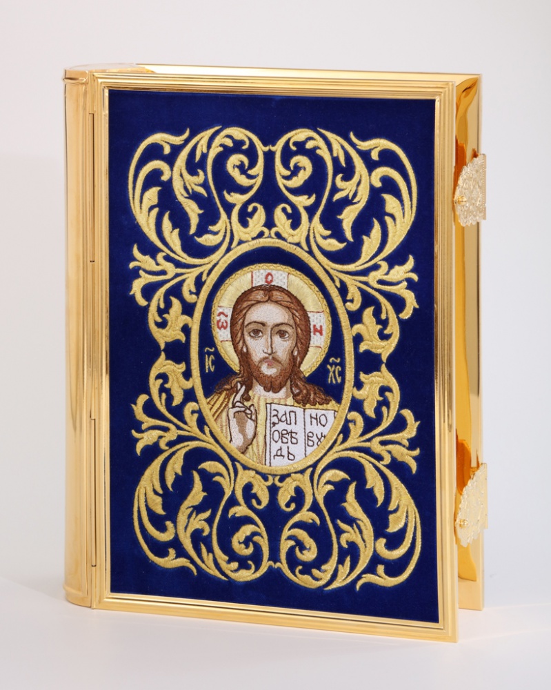 Текст Евангелия отпечатан в типографии ООО "ХПП" СОФРИНО"РПЦ" на церковно-славянском языке с указанием зачал. Данная книга дополняется закладкой из церковной ткани.