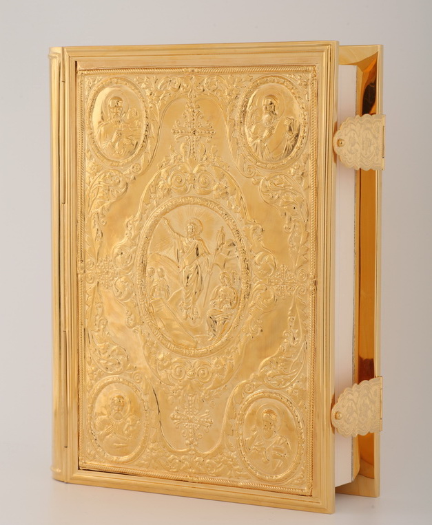 Текст Евангелия отпечатан в типографии ООО "ХПП" СОФРИНО"РПЦ" на церковно-славянском языке с указанием зачал. Данная книга дополняется закладкой из церковной ткани.
