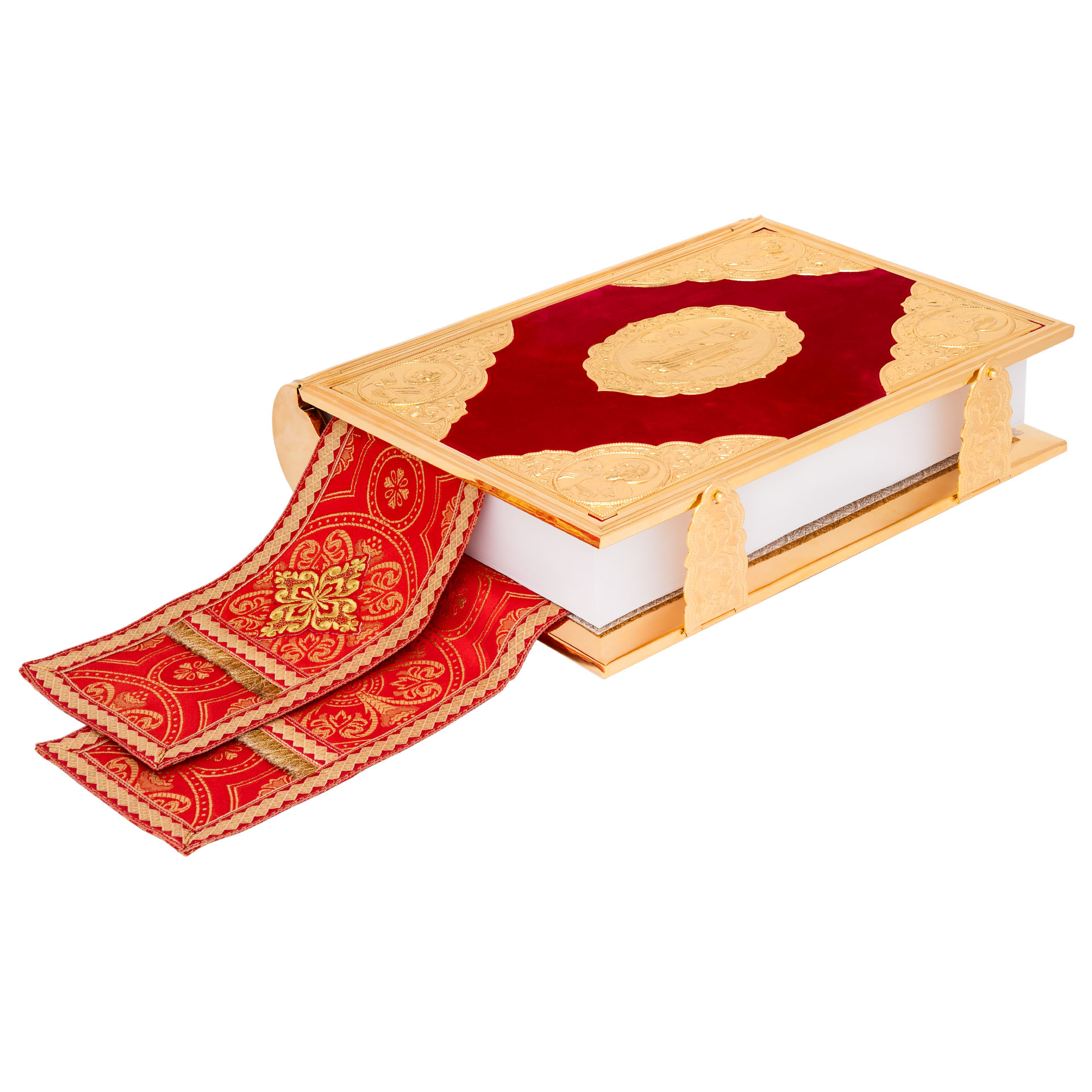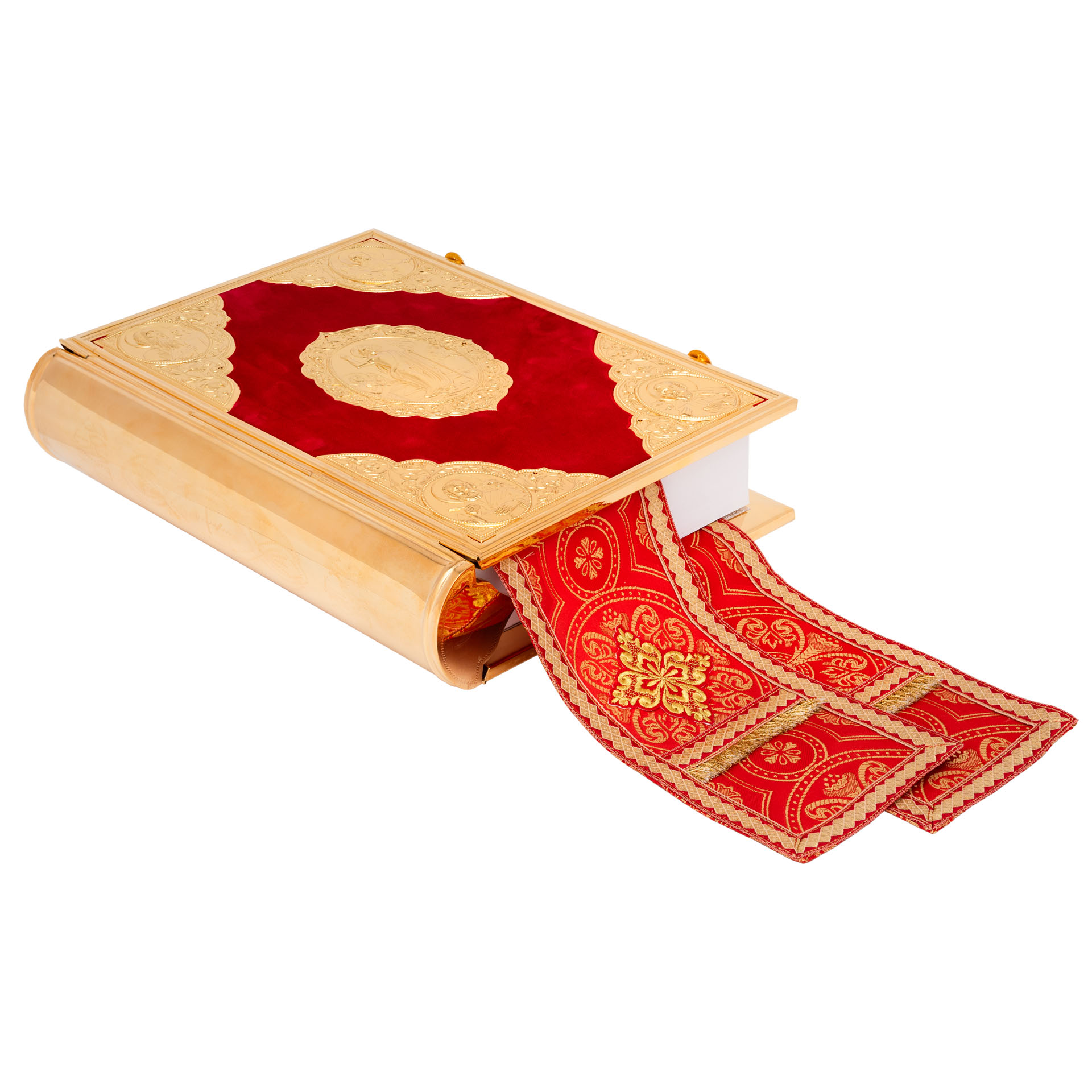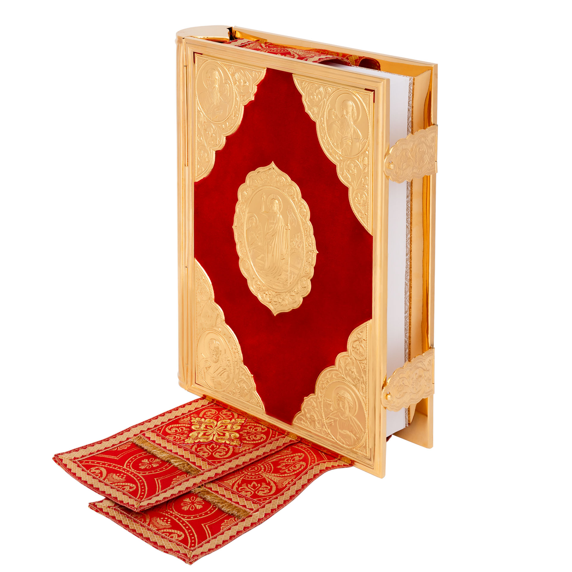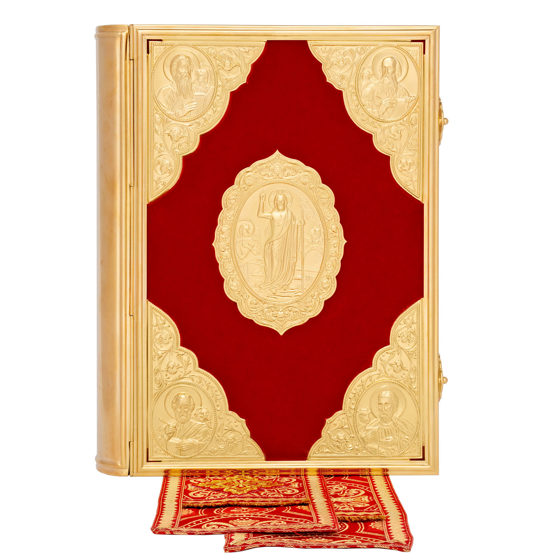 Текст Евангелия отпечатан в типографии ООО "ХПП" СОФРИНО"РПЦ" на церковно-славянском языке с указанием зачал. Данная книга дополняется закладкой из церковной ткани.