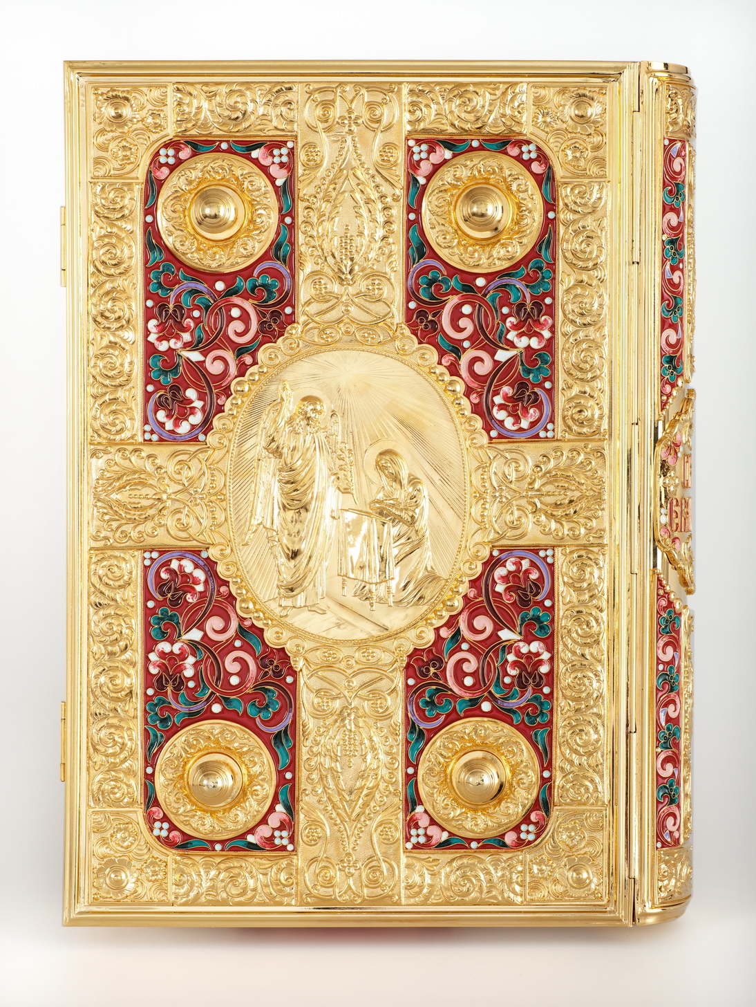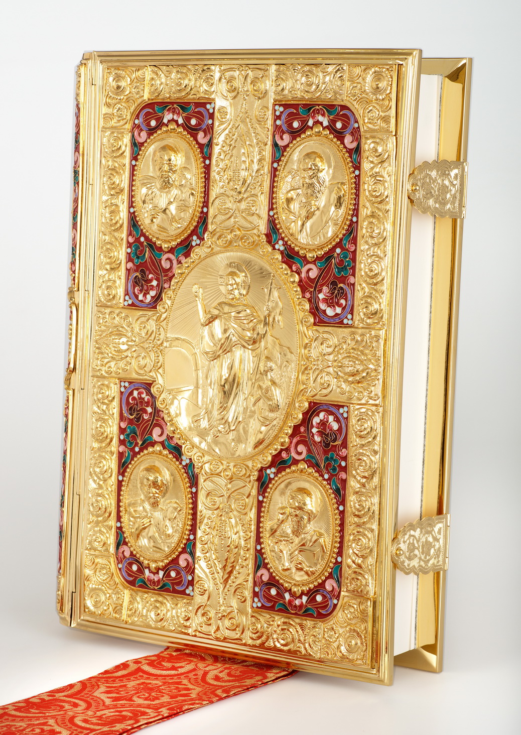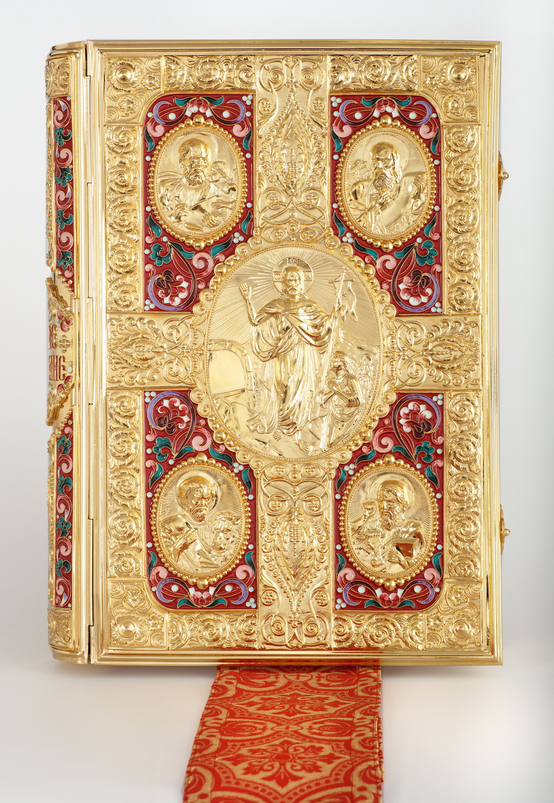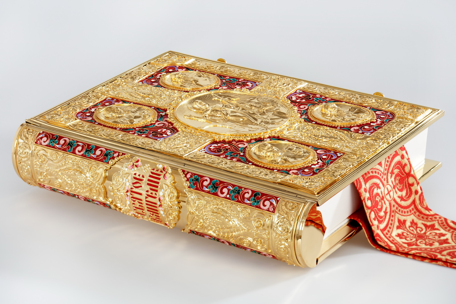 Текст Евангелия отпечатан в типографии ООО "ХПП" СОФРИНО"РПЦ" на церковно-славянском языке с указанием зачал. Данная книга дополняется закладкой из церковной ткани.