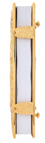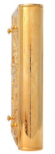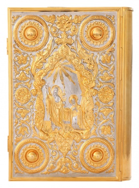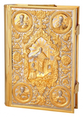 Текст Евангелия отпечатан в типографии ООО "ХПП" СОФРИНО"РПЦ" на церковно-славянском языке с указанием зачал. Данная книга дополняется закладкой из церковной ткани.