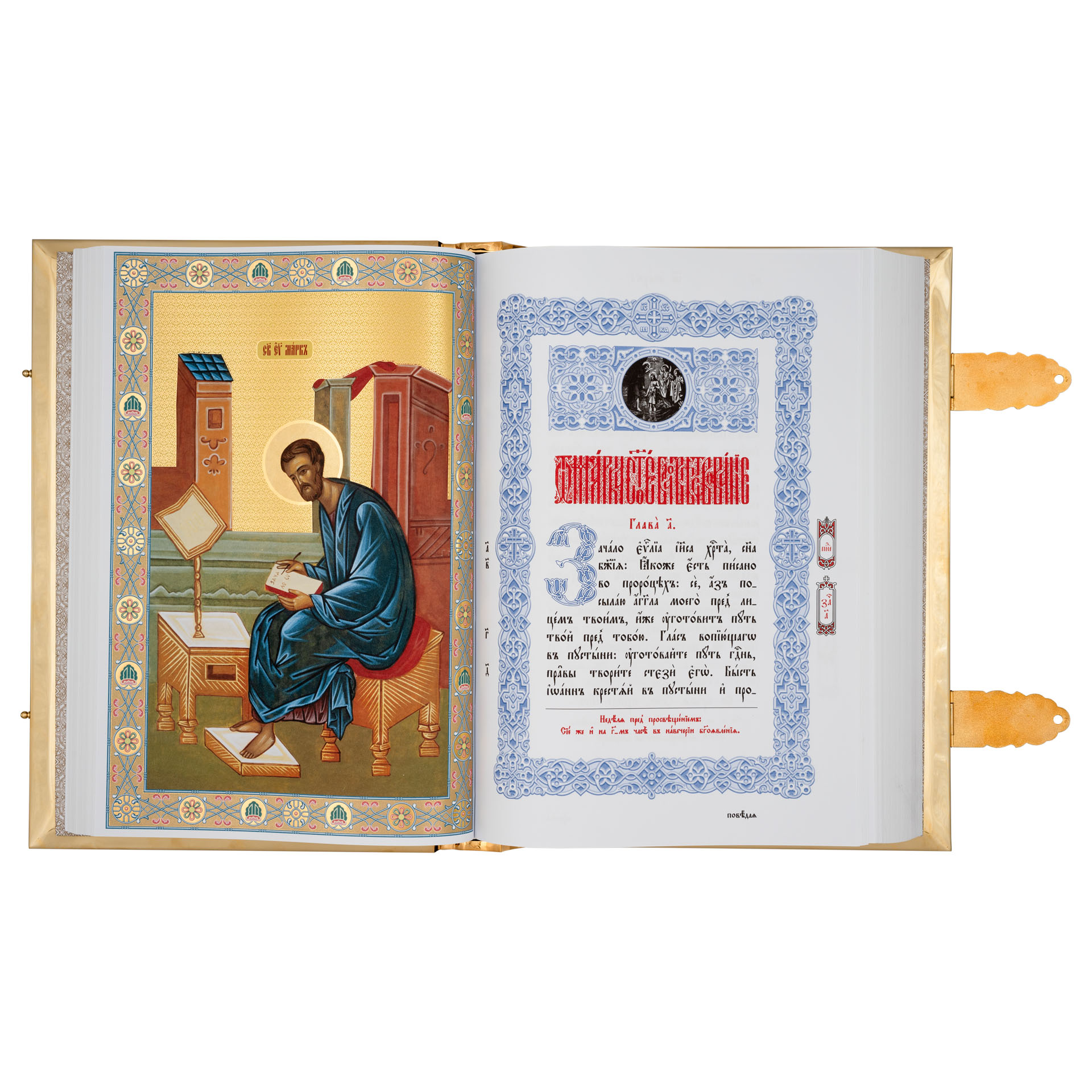 Текст Евангелия отпечатан в типографии ООО "ХПП" СОФРИНО"РПЦ" на церковно-славянском языке с указанием зачал. Данная книга дополняется закладкой из церковной ткани.