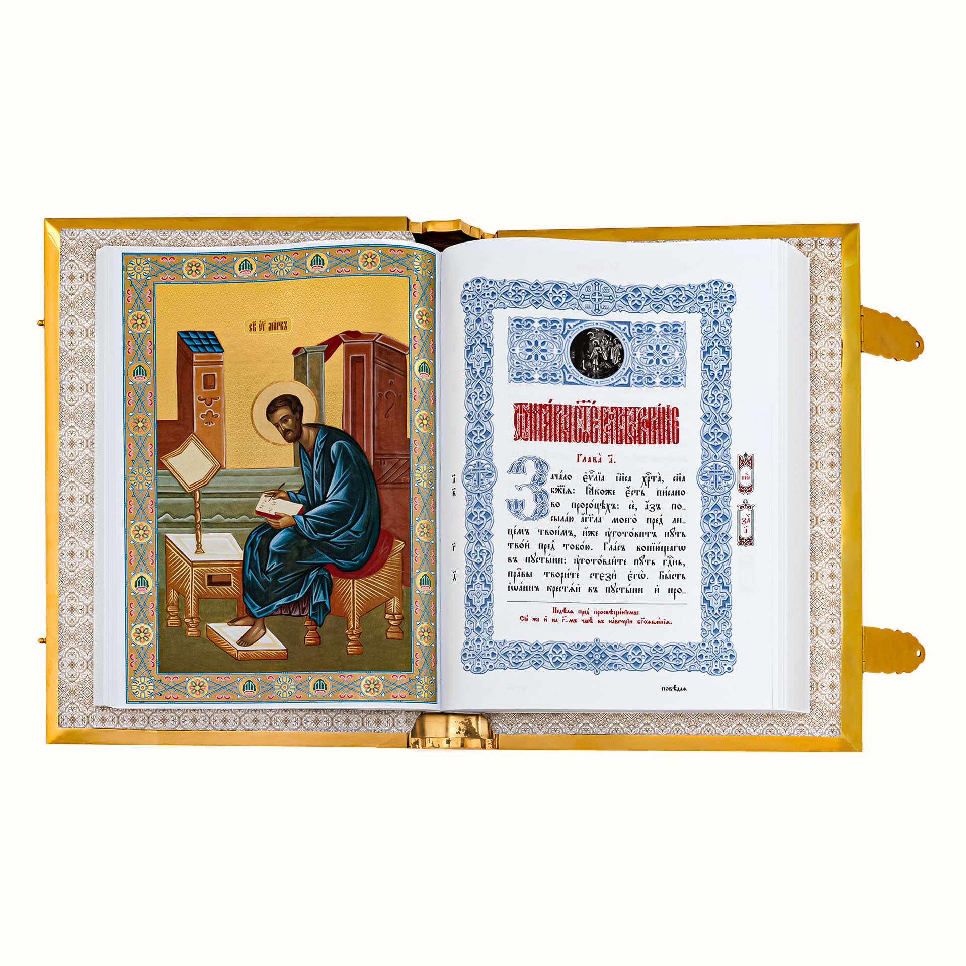 Текст Евангелия отпечатан в типографии ООО "ХПП" СОФРИНО"РПЦ" на церковно-славянском языке с указанием зачал. Данная книга дополняется закладкой из церковной ткани.