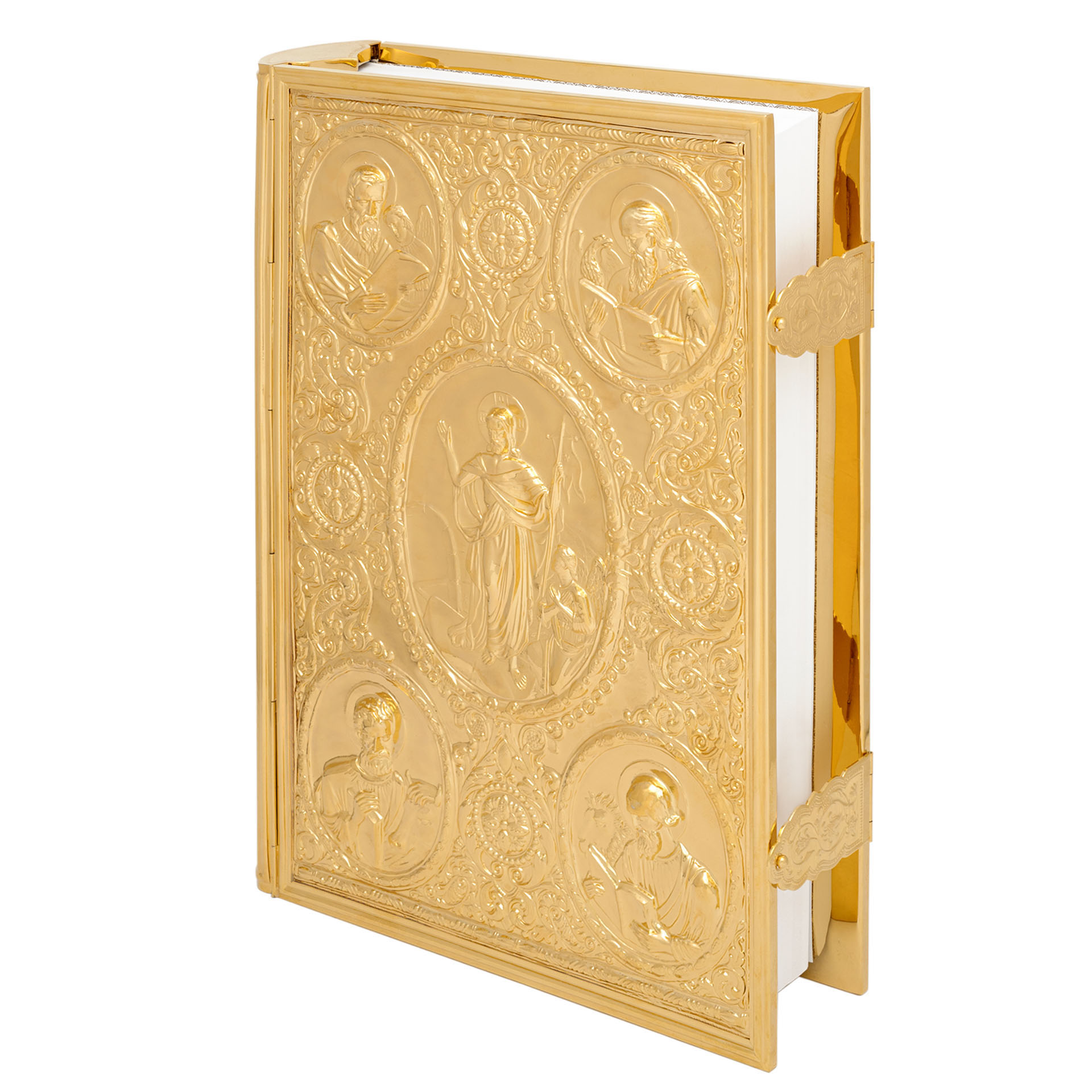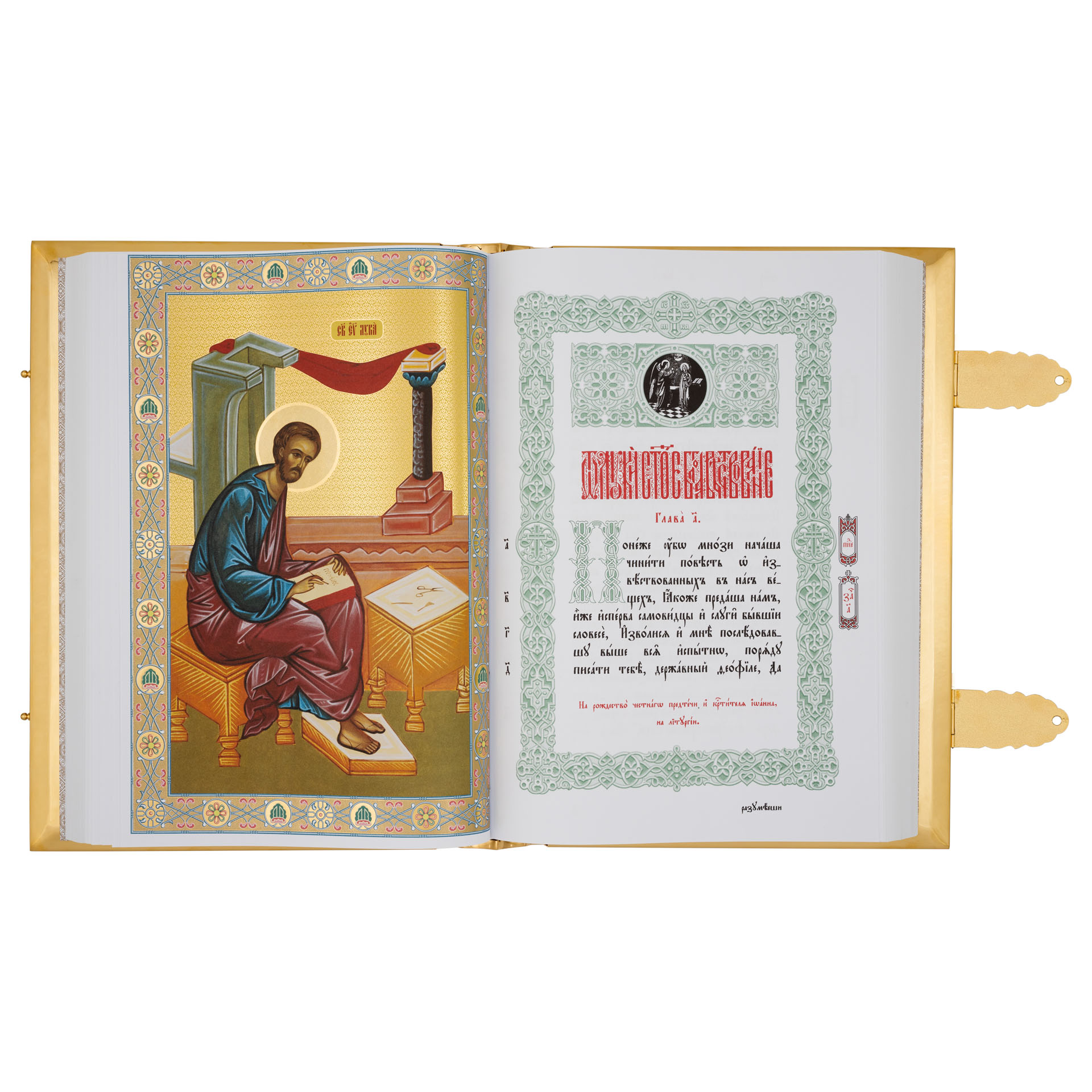 Текст Евангелия отпечатан в типографии ООО "ХПП" СОФРИНО"РПЦ" на церковно-славянском языке с указанием зачал. Данная книга дополняется закладкой из церковной ткани.