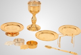 В благородный евхаристический комплект, выполненный из латуни, входит все необходимое для совершения Евхаристии. Потир с мельхиоровым вкладышем имеет объем 0,1 л и габариты 150х80 мм. Дискос (120х40 мм) и два позолоченных блюда (диаметр – 120 мм) украшены ручной гравировкой со священными изображениями. Звездица (60х80 мм) и лжица (165х30 мм) украшены сквозной резьбой. Два ковша (55х20 мм) имеют разное покрытие: золочение и серебрение. Во избежание появления темных пятен на изделиях из мельхиора требуется его надлежащая эксплуатация и уход. Чтобы избежать потемнения изделий из мельхиора, следует сразу после мытья насухо протирать метал мягкой тканью. Каждая капля воды, высохшая на поверхности из мельхиора естественным путем, оставит после себя темную окись.