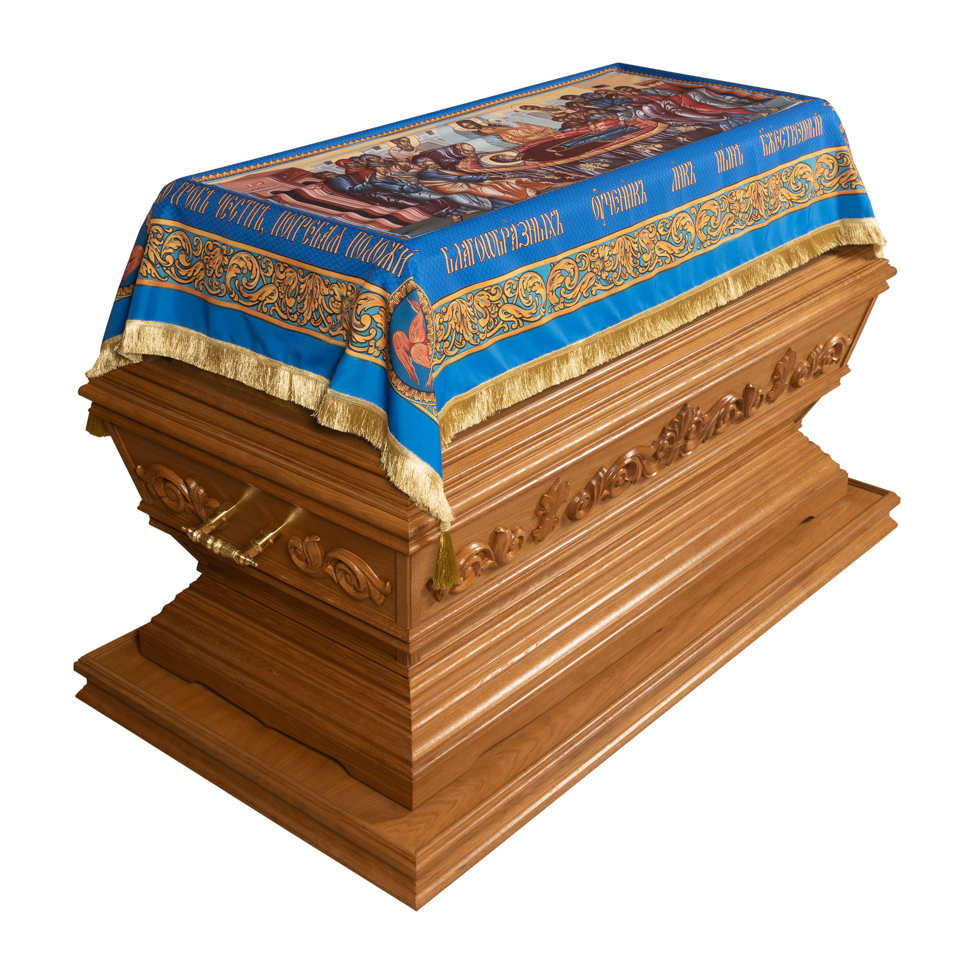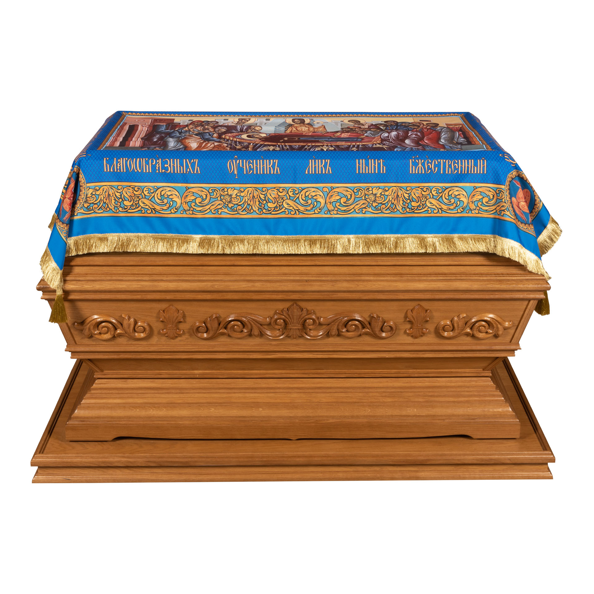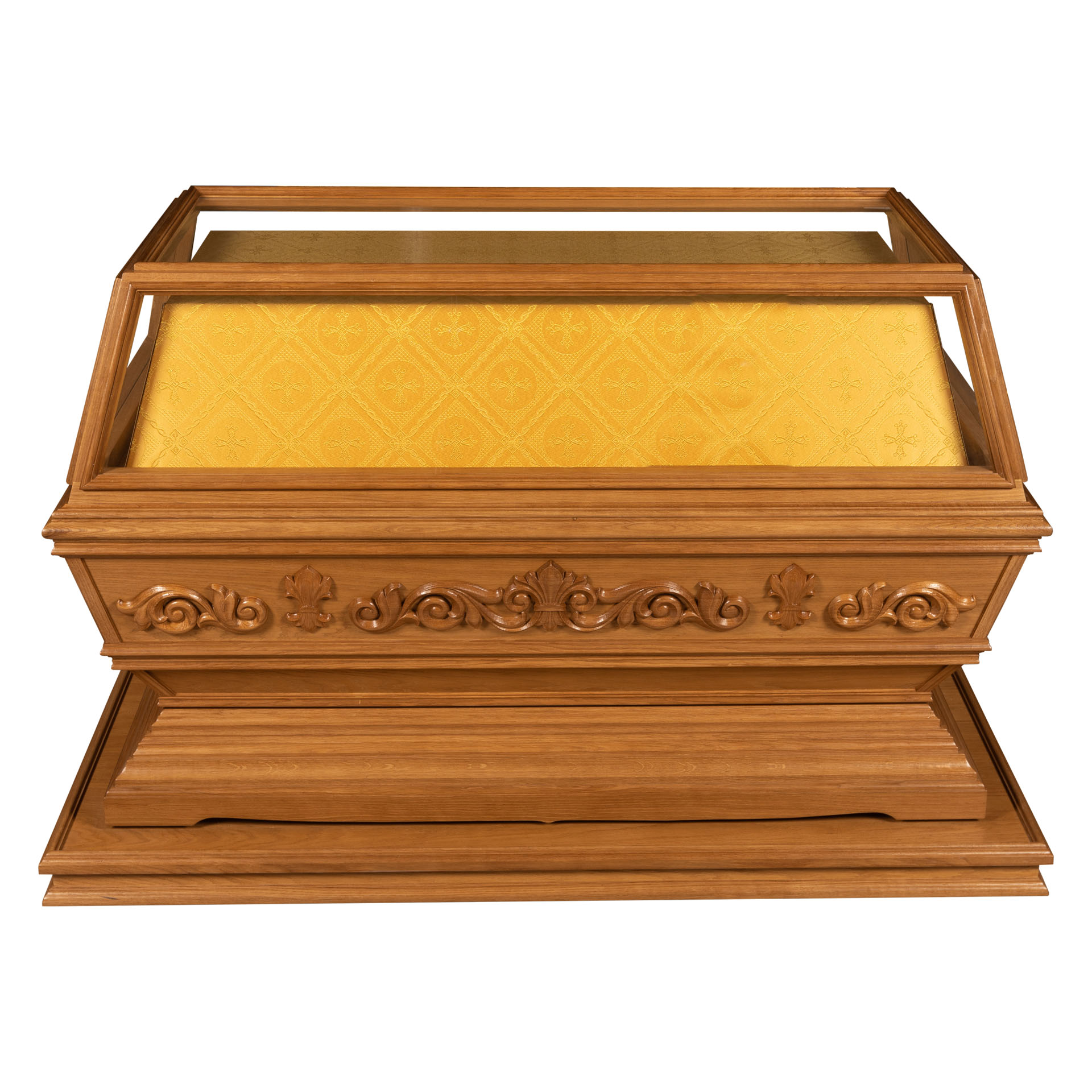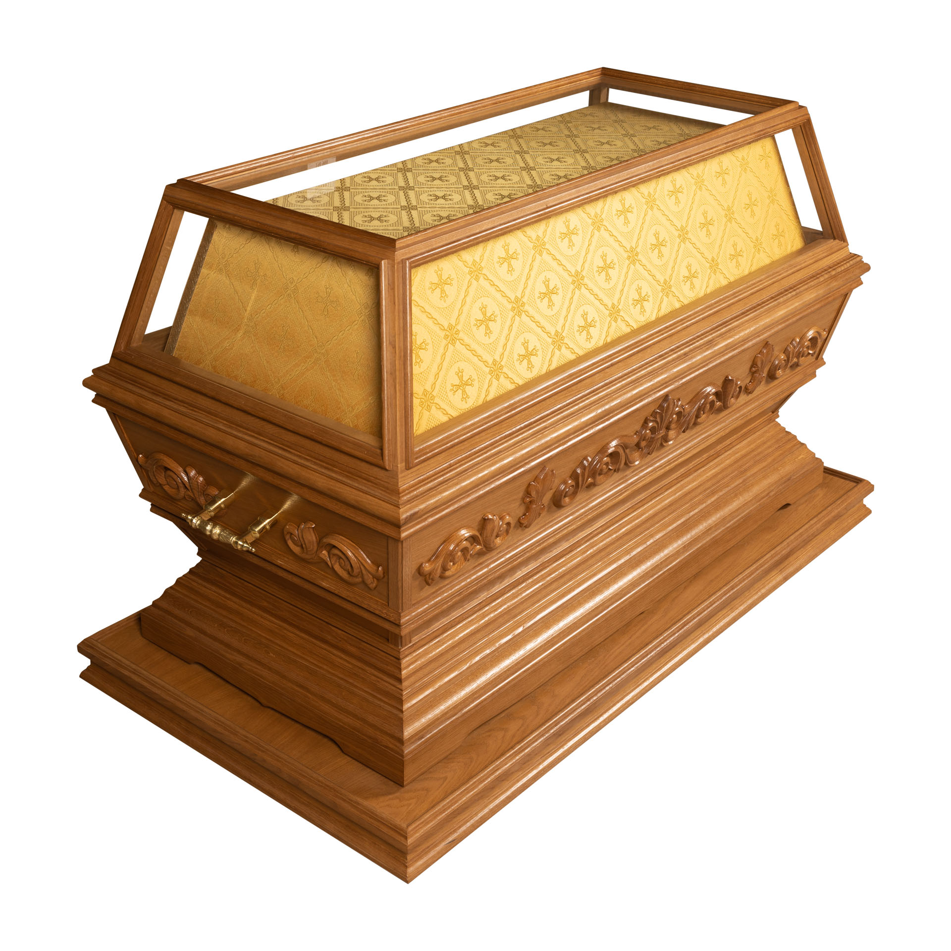 Гробница из дуба, покрытая стеклянной крышкой и окрашенная в цвет по выбору заказчика, впишется в интерьер любого храма. Боковые стороны гробницы украшены лаконичными узорами накладной резьбы.