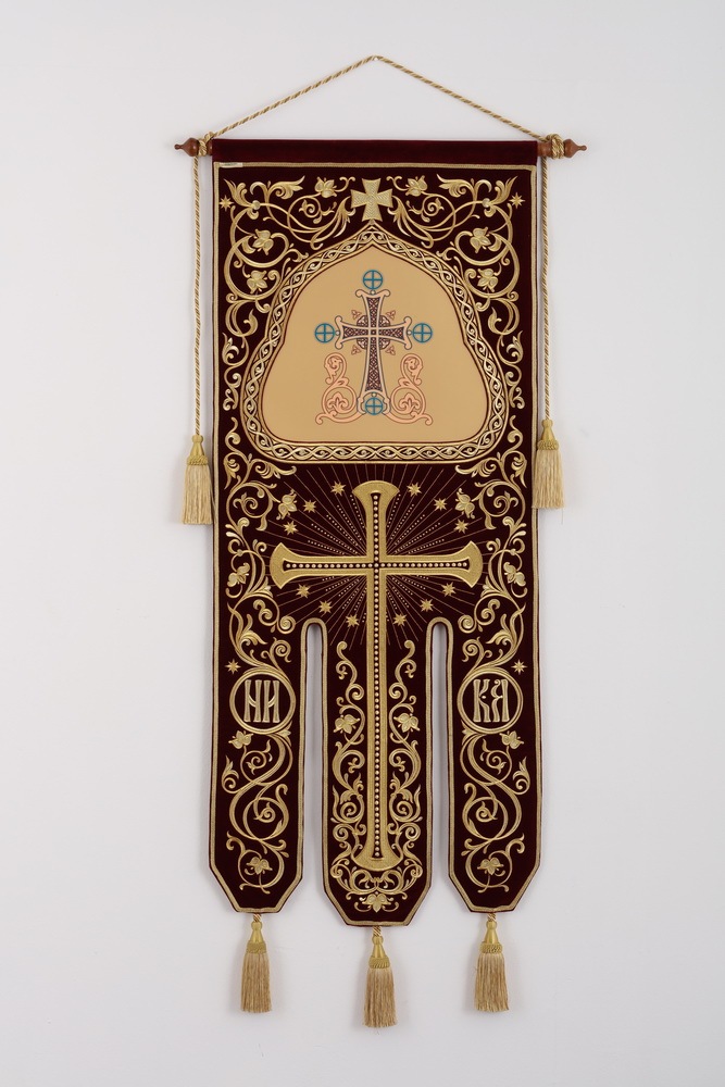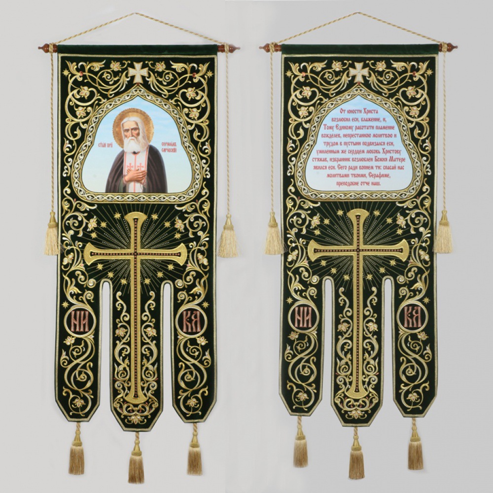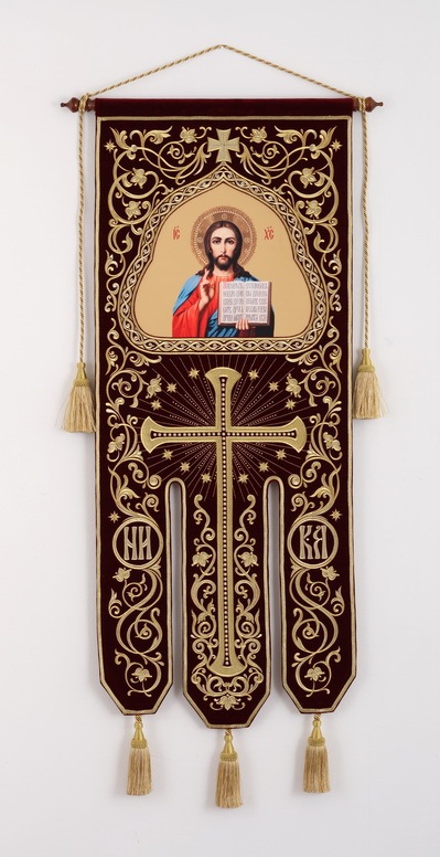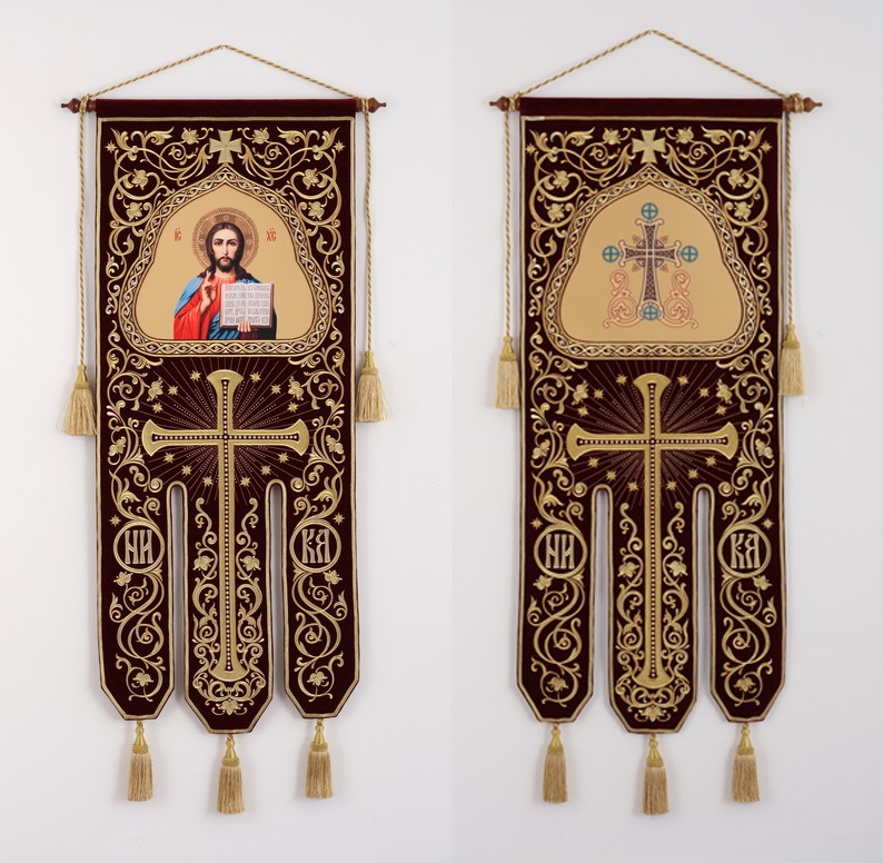 Хоругвь можно изготовить с любым изображением, а также выбрать цвет бархата.