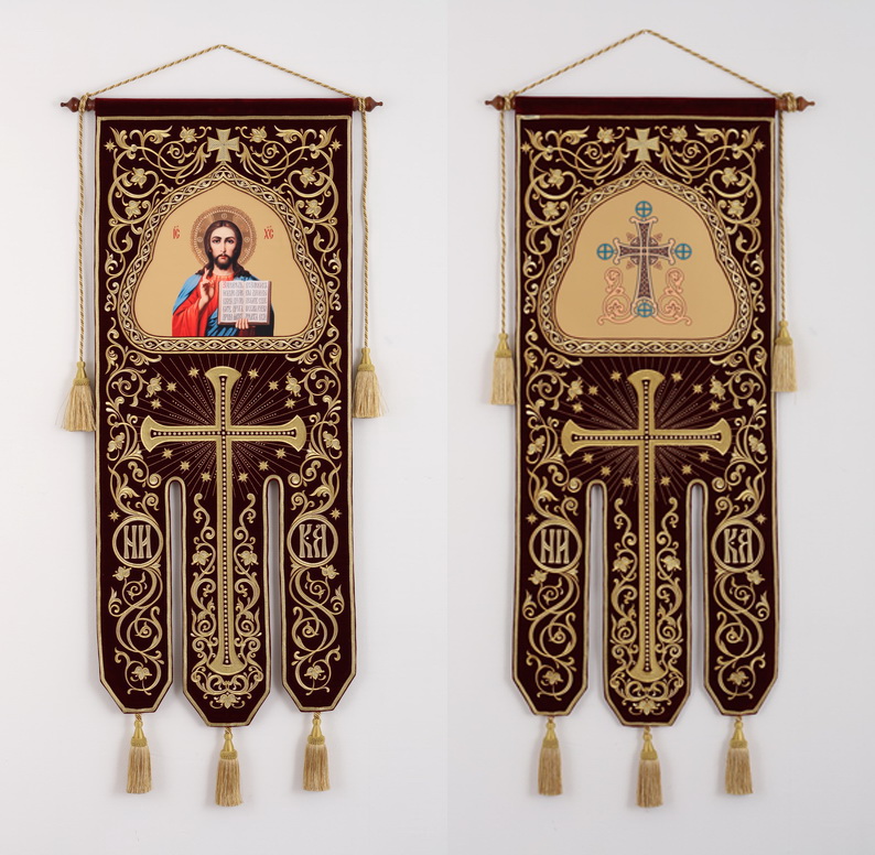 Хоругвь можно изготовить с любым изображением, а также выбрать цвет бархата.