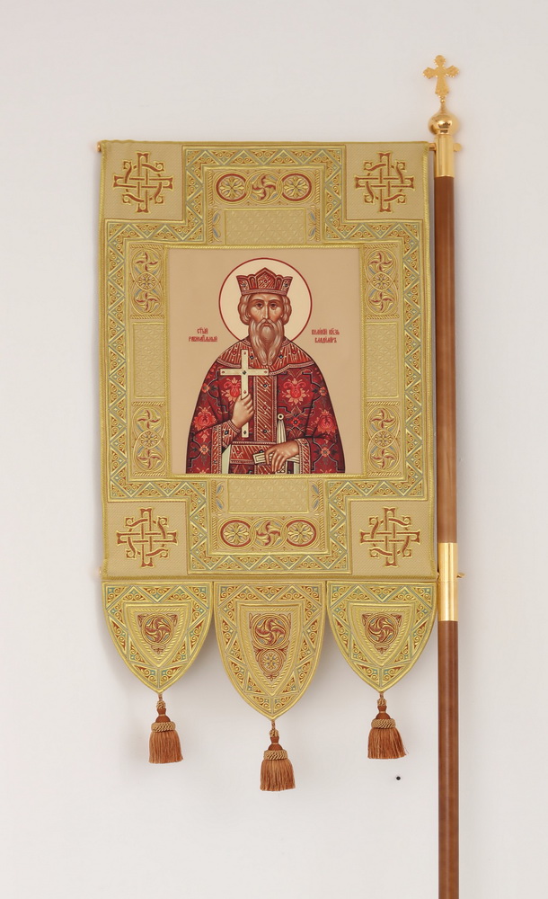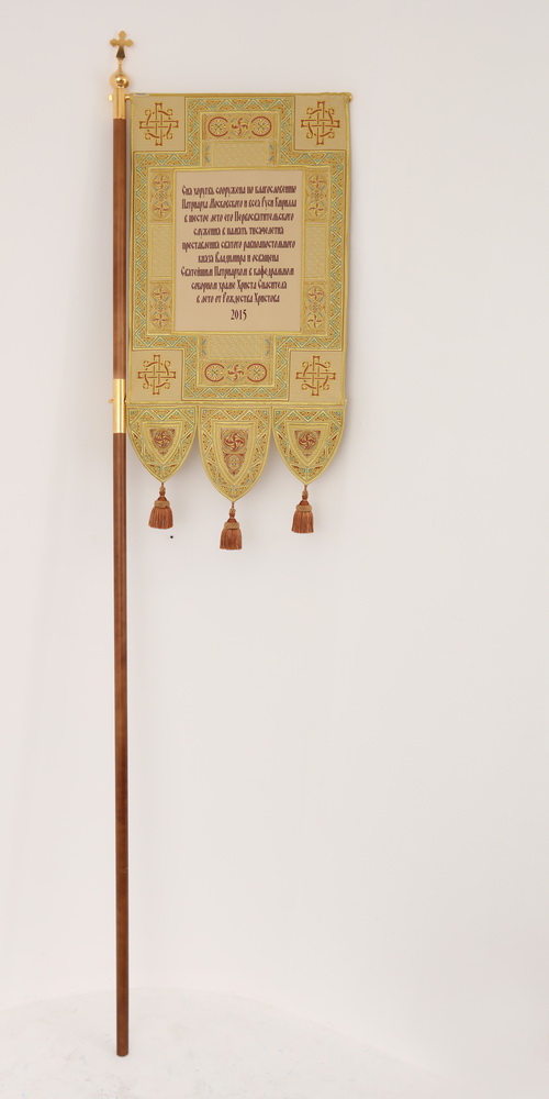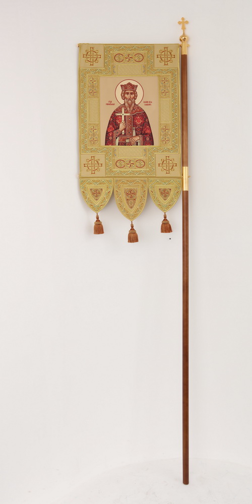 Хоругви выполненные из глазета. Декоративные элементы - автоматическая вышивка, кисти, тесьма. Древко в комплекте.
