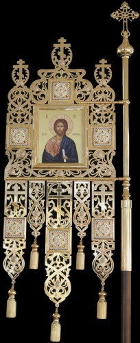 Позолоченная хоругвь прямоугольной формы выполнена из латуни и меди. На иконе, размещенной в центре, изображен Христос Вседержитель, который правой рукой благословляет собравшихся, а в левой руке держит свиток. Вокруг иконы причудливым узором разместились орнаменты, выполненные в технике литья, гальванопластики, ручной и химической гравировки. Металлические узоры украшены камнями и разноцветными эмалевыми элементами. Диаметр древка 45 мм.