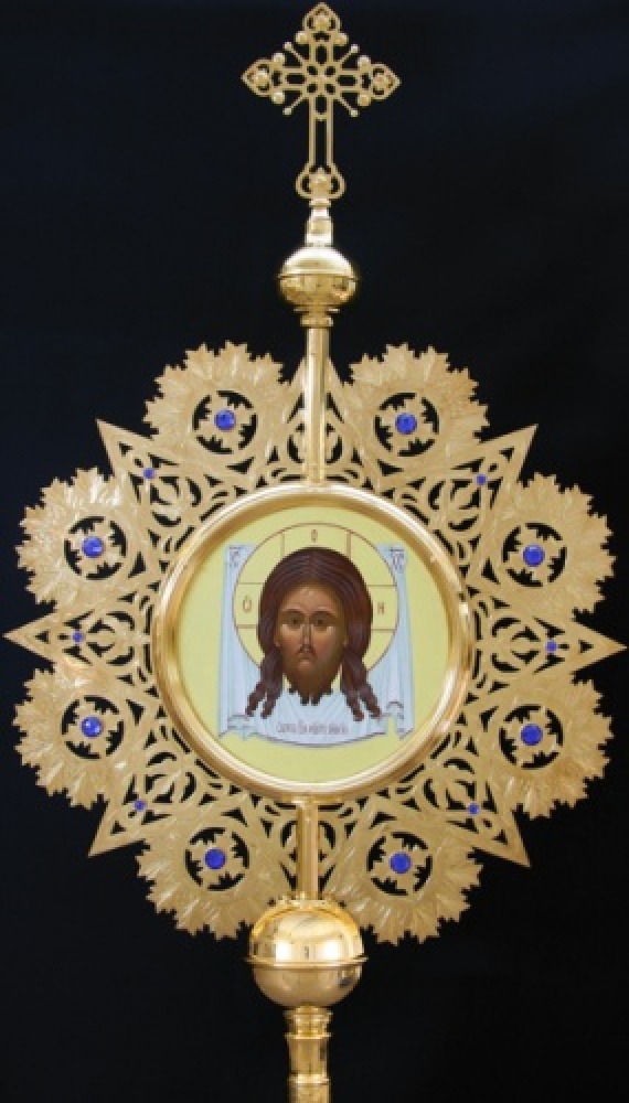 Необычная хоругвь круглой формы напоминает солнце или звезду. На изящных золотых узорах красиво смотрятся сияющие голубые камни. В центре круга расположена икона Спаса Нерукотворного, на которой изображен лик Иисуса Христа, чудесным образом запечатленный при умывании на полотенце. Наконечник древка увенчан золотым крестом.