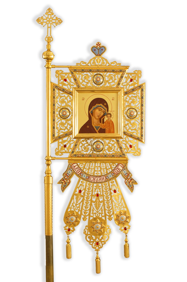 В центре позолоченной праздничной хоругви размещена икона Божией Матери «Казанская». Тонкие металлических узоры красиво дополнены яркими эмалевыми рисунками и сияющими камнями. Над иконой изображена царская корона, а под иконой – свиток со словами из книги пророка Исаии, ставшими гимном: «Яко с нами Бог». Размер хоругви составляет 560х1400 мм.