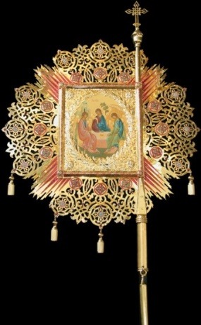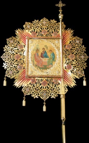 Круглая хоругвь имеет размер 1200х1300 мм. В центре хоругви размещена икона Святой Троицы, от которой исходят покрытые алой эмалью лучи света. Золотые орнаменты красиво дополнены эмалевыми вставками и камнями. Снизу хоругвь украшена кистями золотой бахромы.