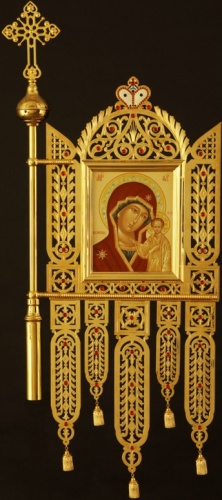 Прямоугольная хоругвь украшена многочисленными узорами, выполненными в технике выпиловки и гравировки. В центре хоругви размещена икона Божией Матери «Казанская», а над ней – покрытая белой эмалью корона, напоминающая о царском достоинстве Богородицы. Золотые узоры украшены бордовыми камнями, перекликающимися по цвету с омофором Божией Матери и объединяющими икону и основание хоругви в цельное произведение церковного искусства.