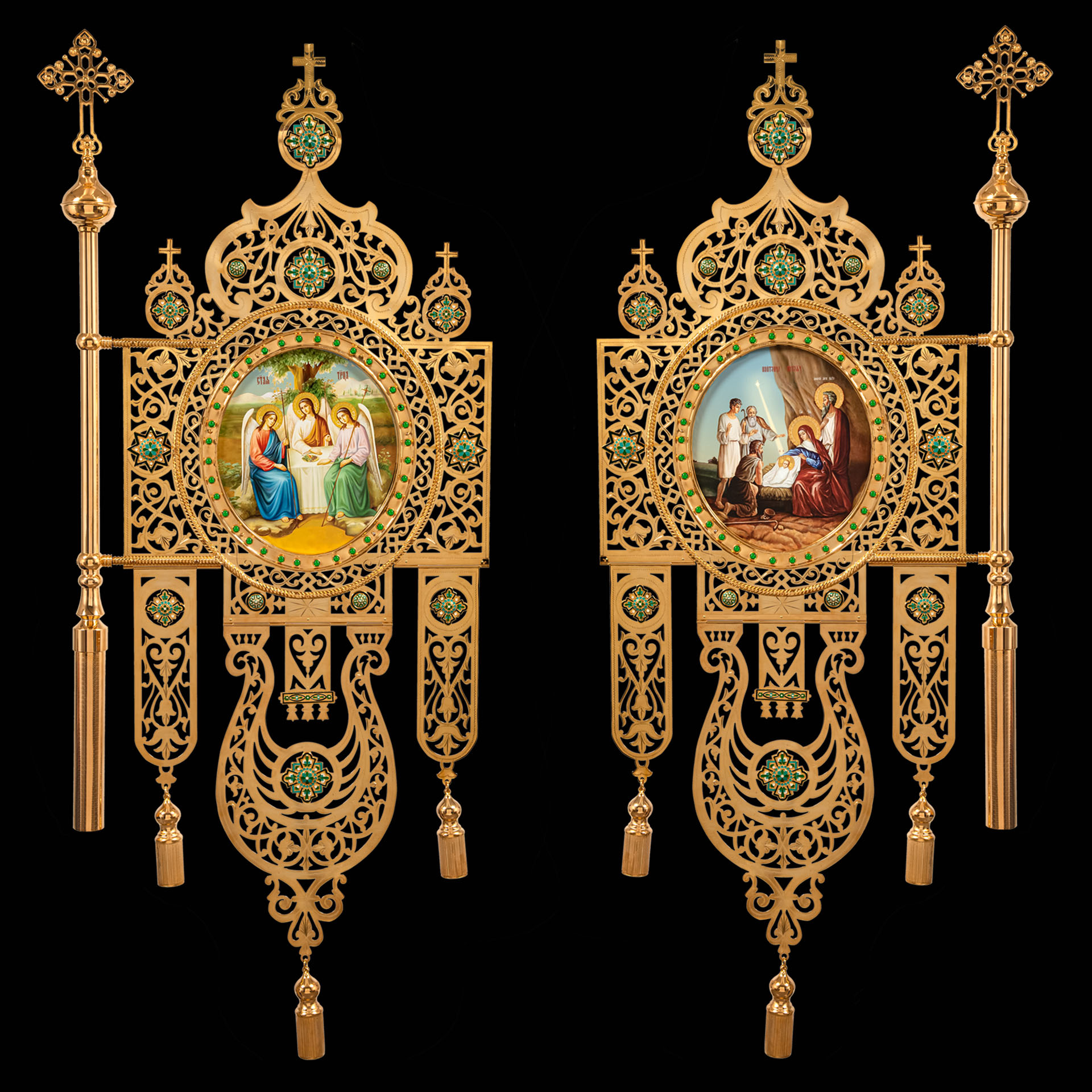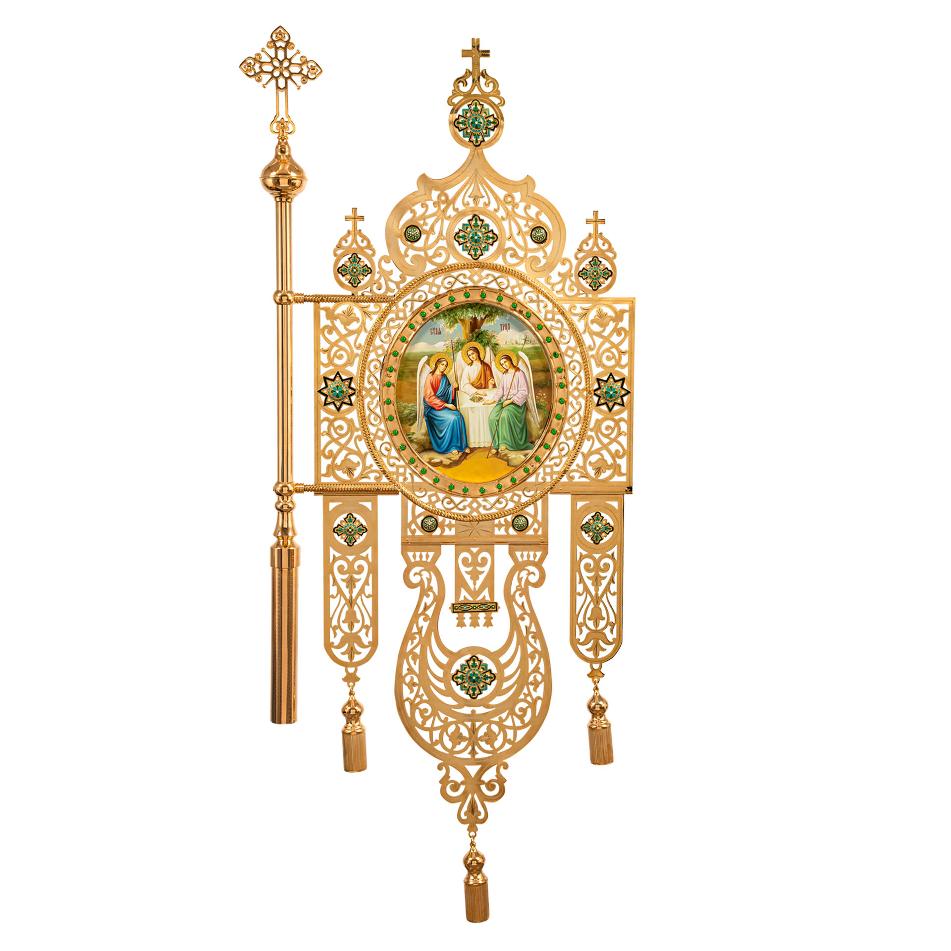 Богато украшенная металлическими орнаментами хоругвь имеет размеры 553х1402 мм. В центре хоругви размещена икона Святой Троицы, изображенной в виде трех ангелов, восседающих за столом под Мамврийским дубом. Золотое кружево узоров украшено сверкающими камни и цветными эмалевыми вставками. Наконечник древка, диаметр которого 45 мм, увенчан крестом – символом победы Христа над смертью и диаволом.