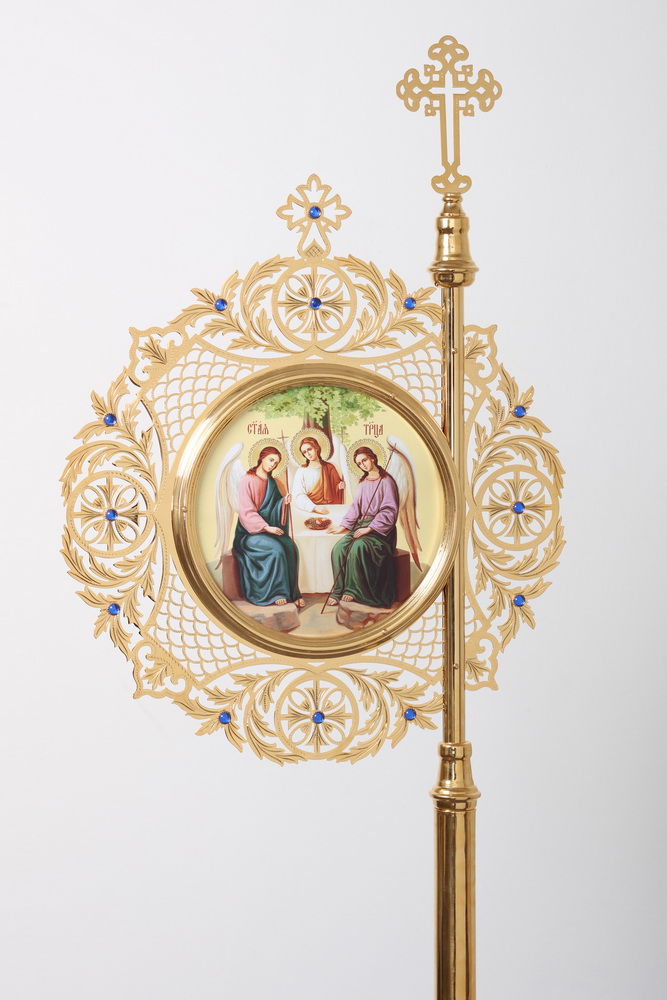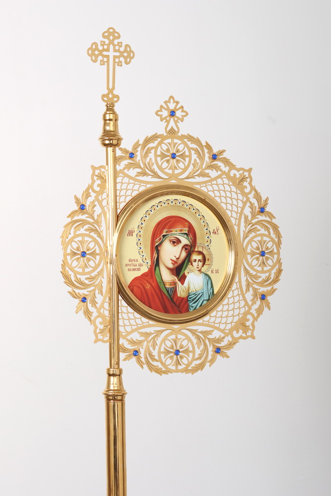 Круглые хоругви, изготовленные методом выпиловки и гравировки, выполнены настолько изящно, что металлические орнаменты кажутся кружевными и невесомыми. На золотом фоне красиво расставлены акценты в виде сияющих камней. В центре хоругвей размещены иконы Святой Троицы и Божией Матери «Казанской», которые сразу притягивают взгляд насыщенными красками и благородным письмом.