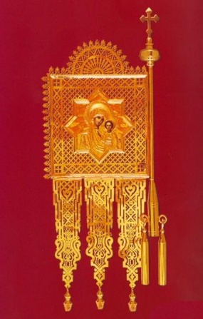 Эта хоругвь сразу привлекает к себе внимание необычной формой иконы, которая восьмиконечной звездой сияет на узорчатом фоне. Внутри звезды изображена Божия Матерь с Младенцем на руках. Выполненная из латуни и меди и покрытая позолотой, данная хоругвь имеет размеры 590х1400 мм. Диаметр древка 45 мм