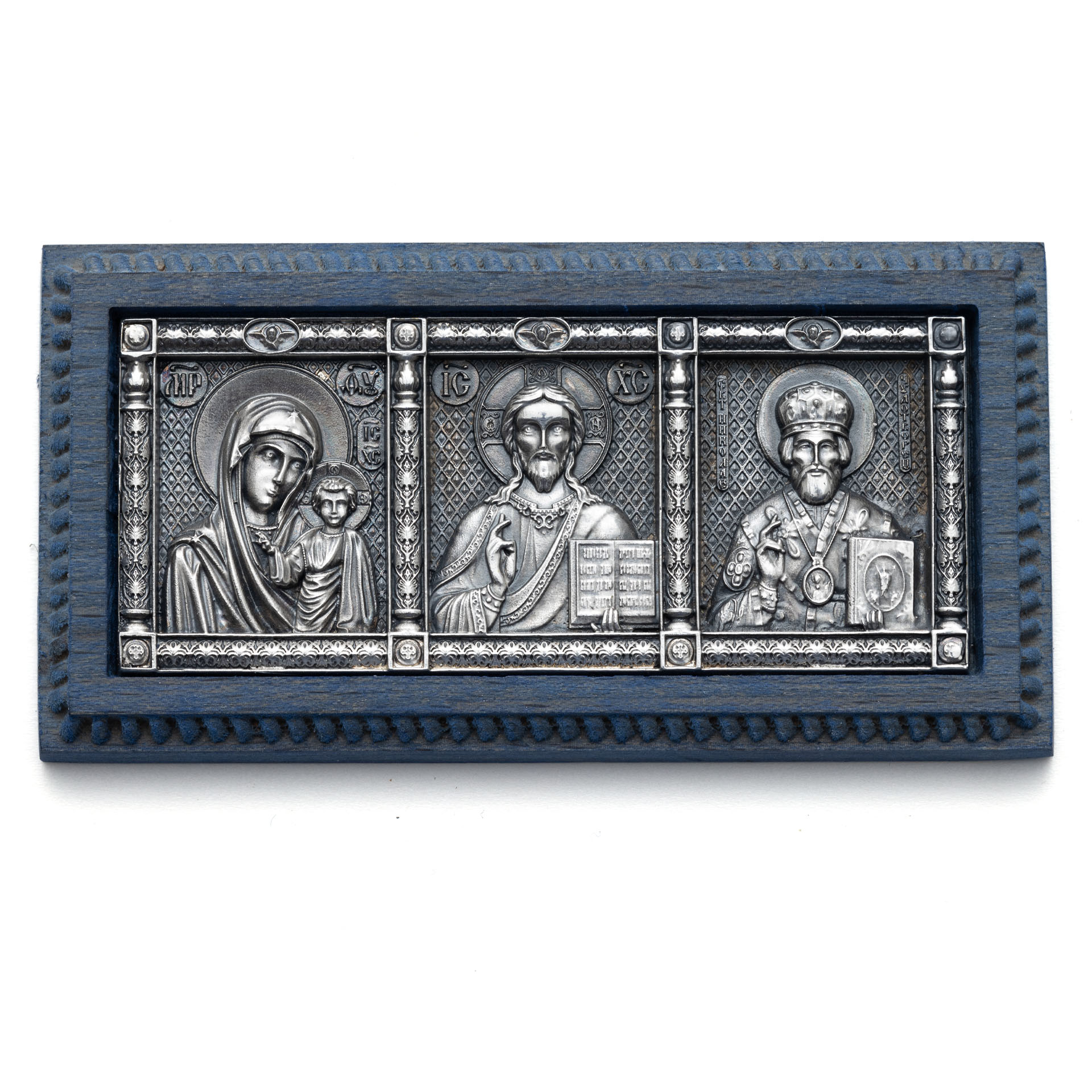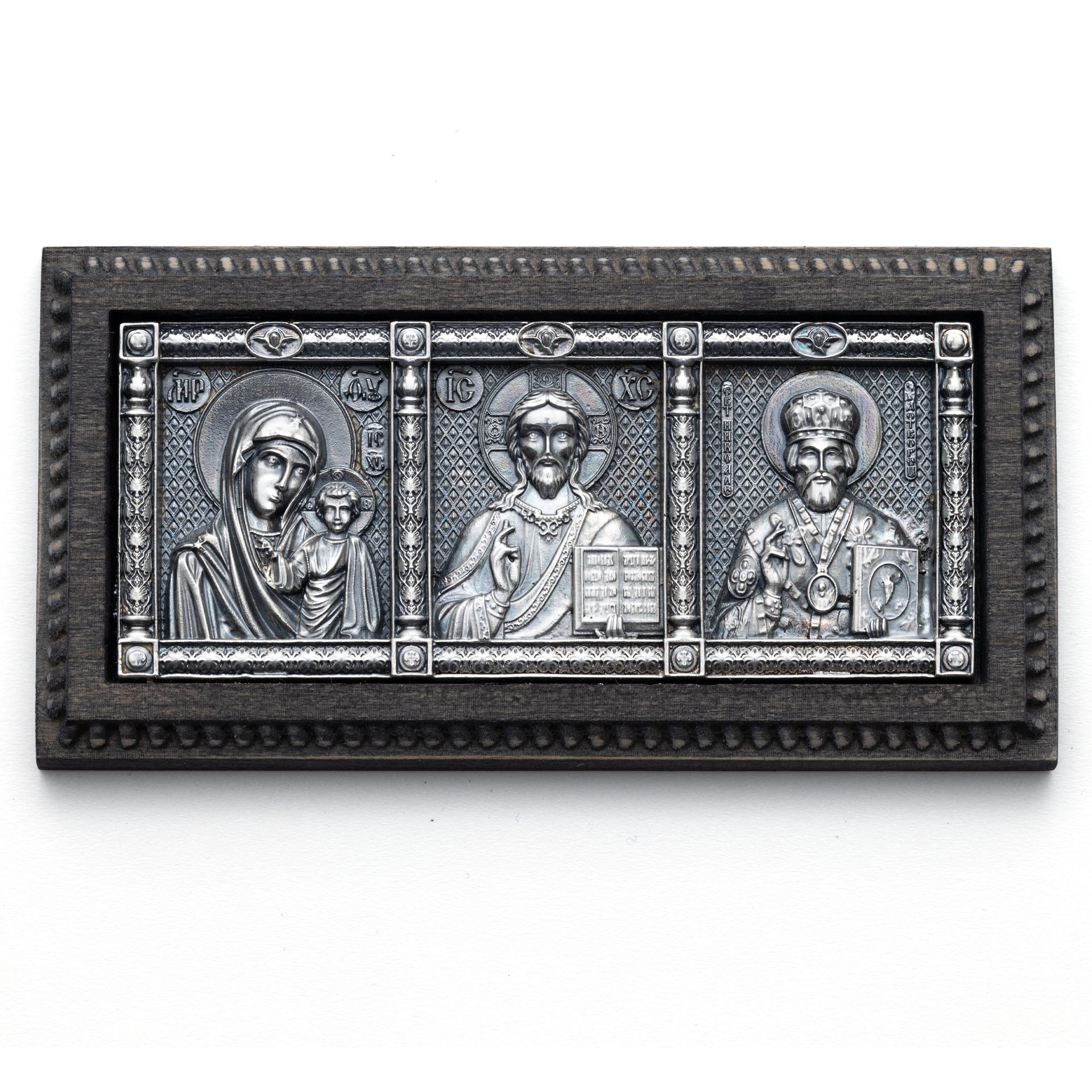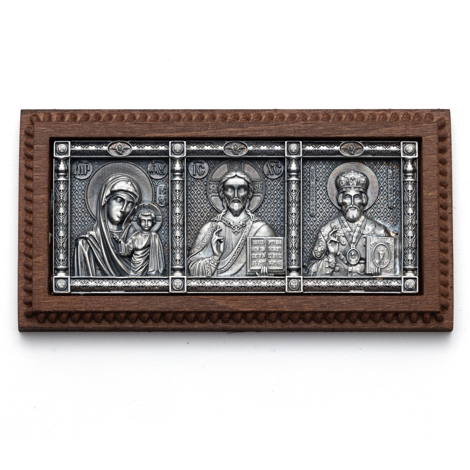 Икона автомобильная №2 / серебрение / деревянная вставка Казанская Б.М.-Спаситель-Николай Чудотворец