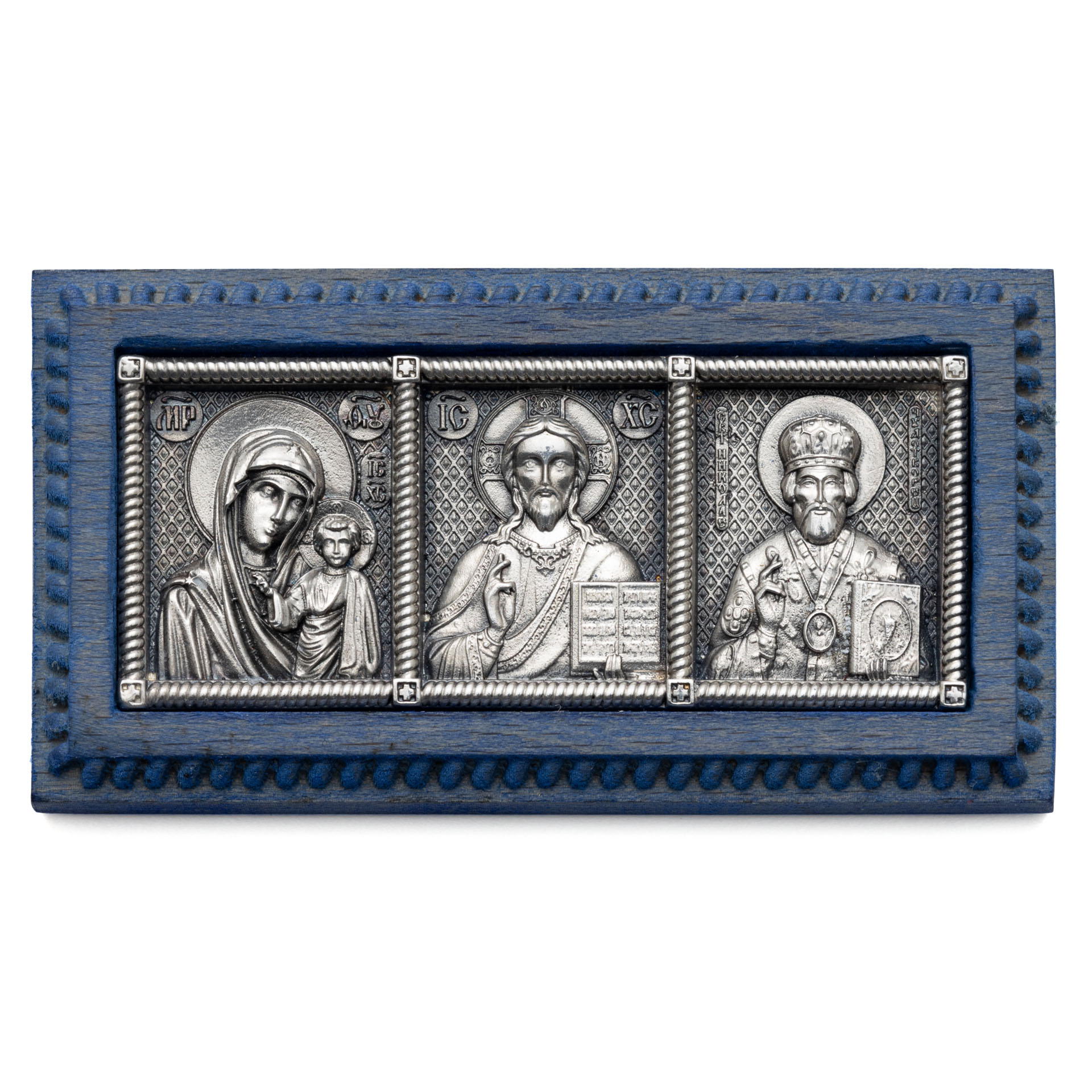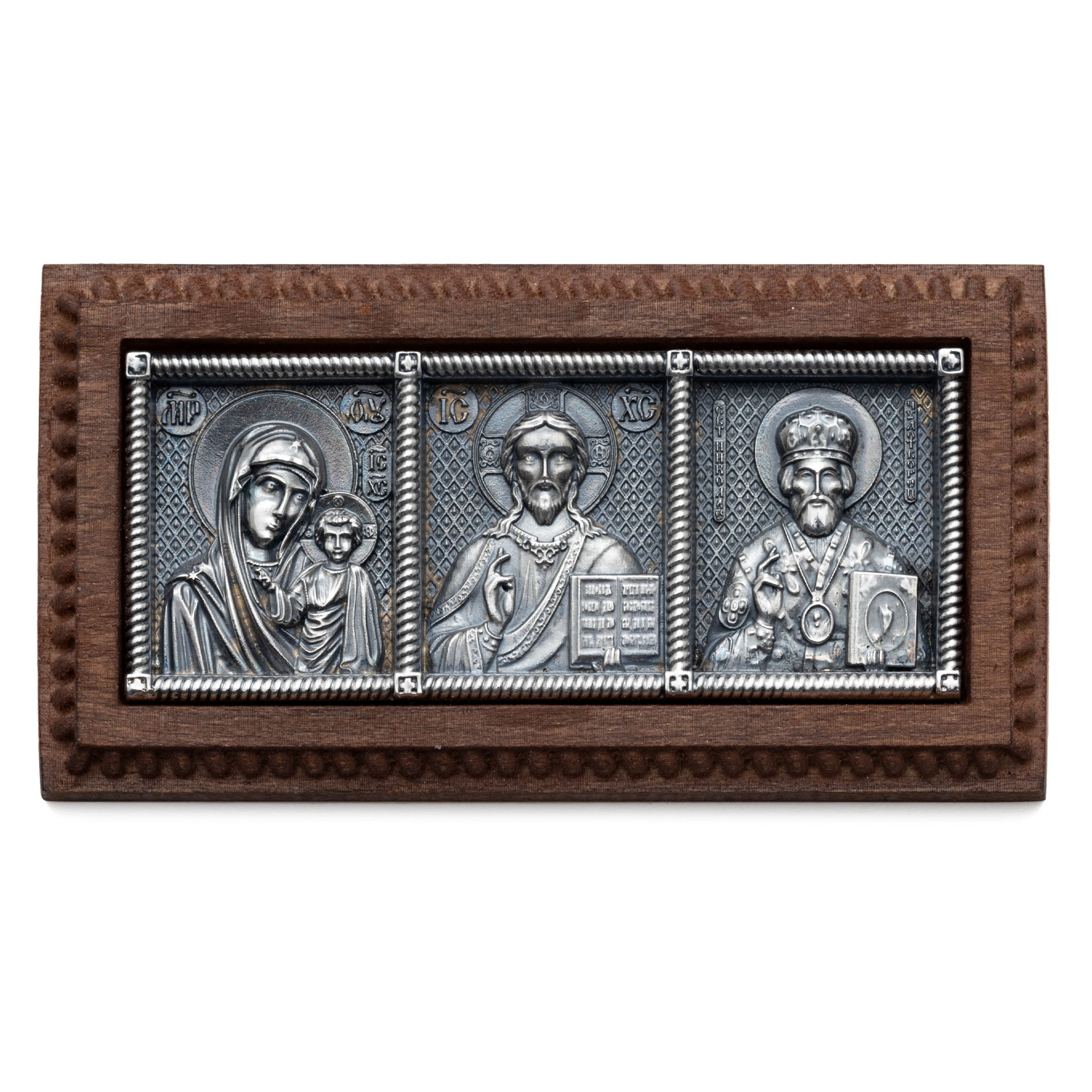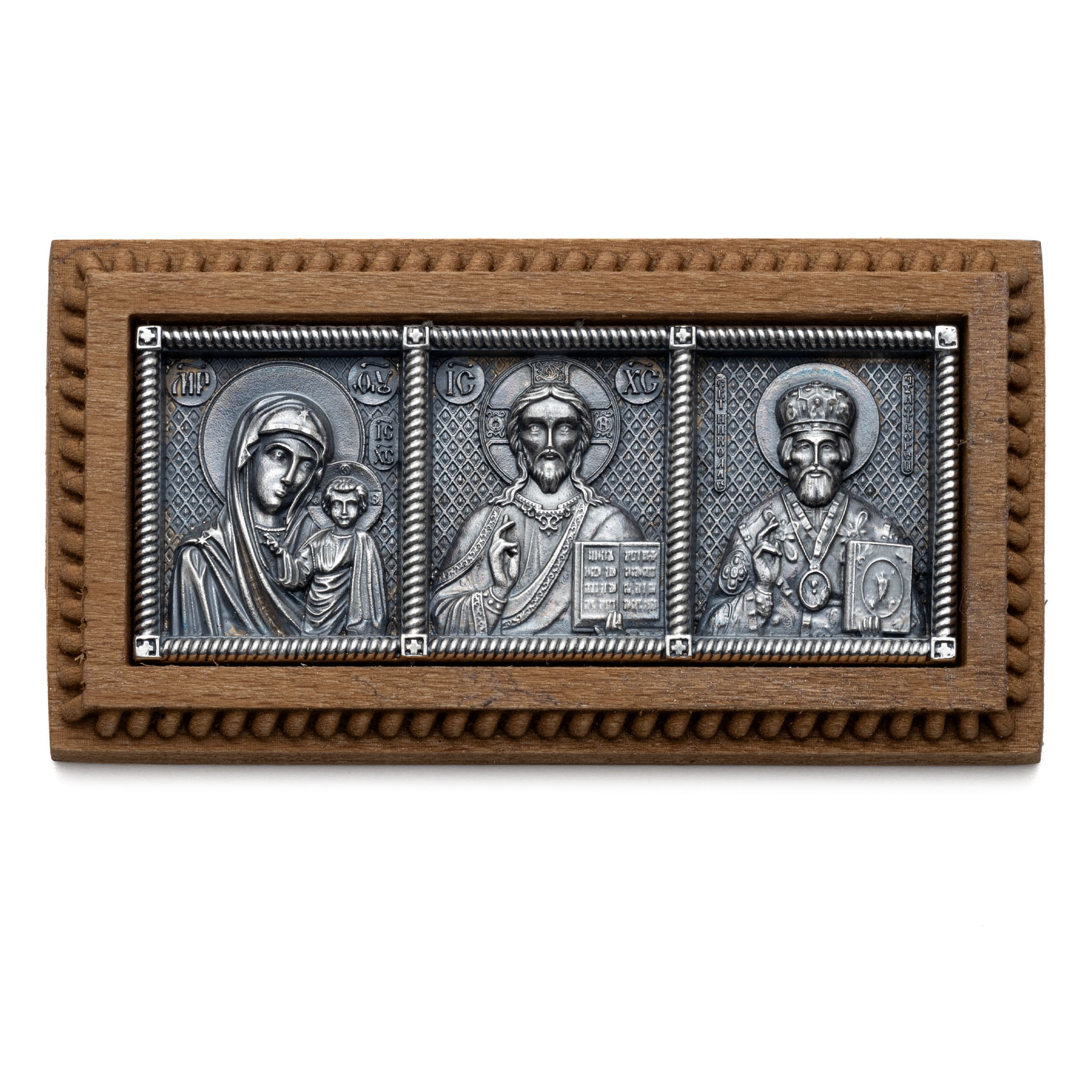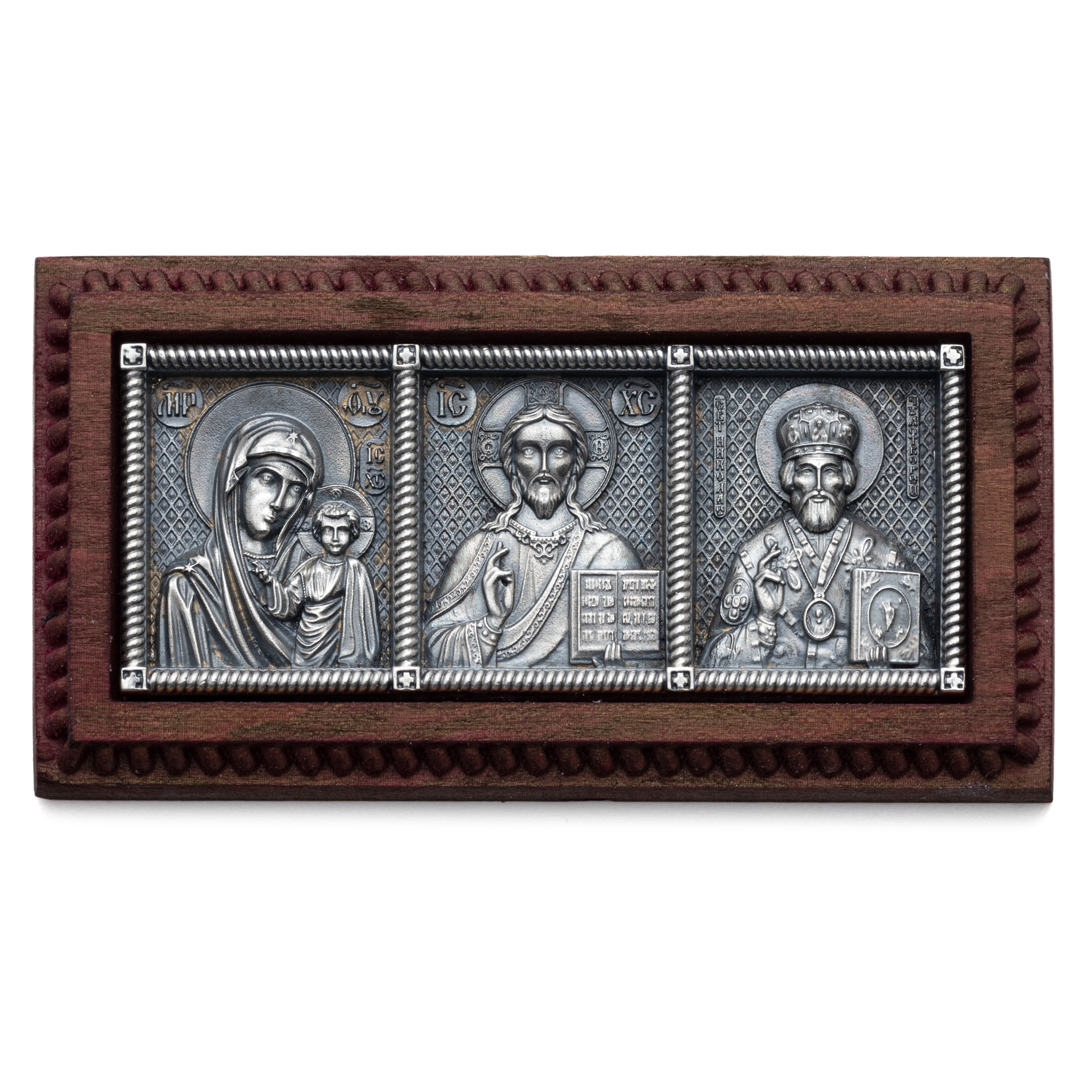 Икона автомобильная №3 / серебрение / деревянная вставка Казанская Б.М.-Спаситель-Николай Чудотворец