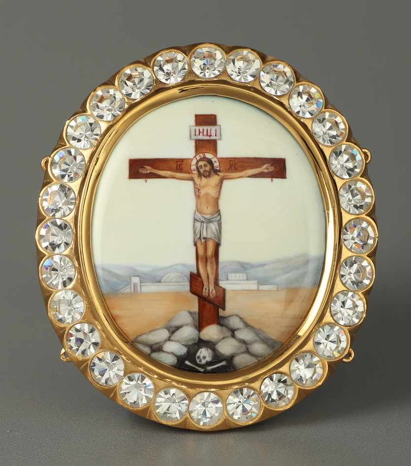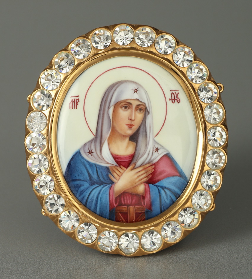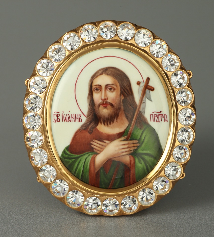 Цена указана за 1 икону. Царственный комплект икон для митры состоит из 4 ликов: Иисуса Христа, Богородицы, Иоанна Крестителя и Распятия. Крупные поясные иконы благородных цветов выполнены методом финифти. По периметру овальные позолоченные медальоны украшены объемными многогранными камнями, которые будут ярко переливаться при свете паникадила и свечей.