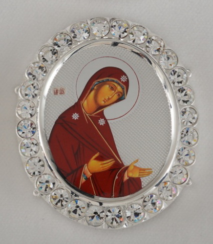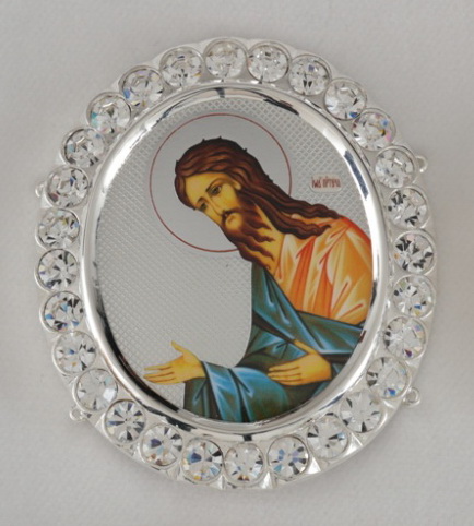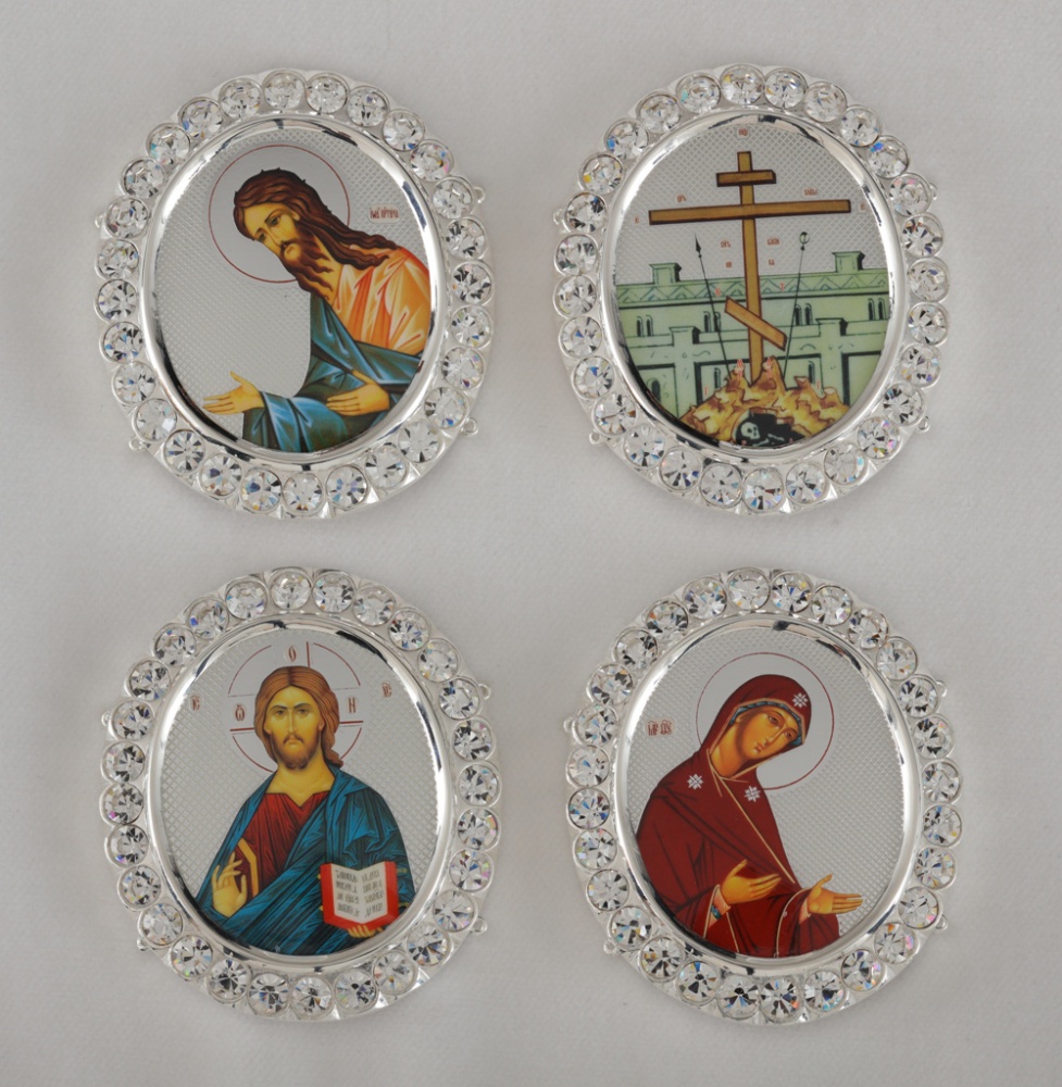 Цена указана за 1 икону. В посеребренный комплект икон для митры входят лики Иисуса Христа, Богородицы, Иоанна Крестителя, а также изображение Креста Господня. По периметру иконы украшены камнями. Изделия упакованы в картонную коробку размером 200х110х37 мм.