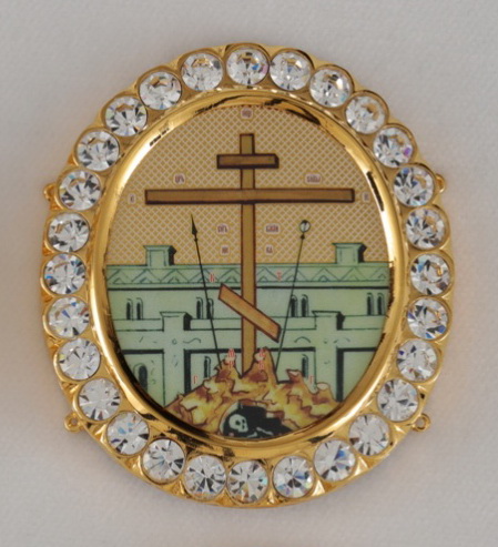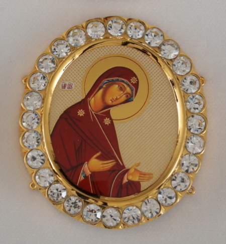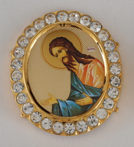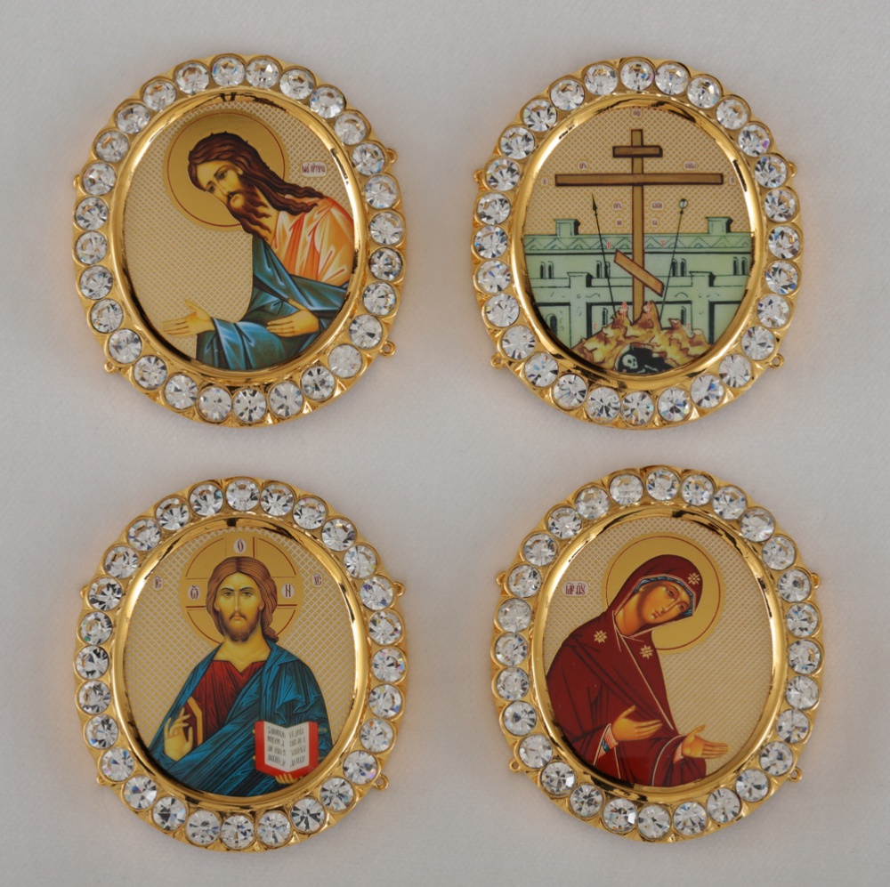 Цена указана за 1 икону. В классический позолоченный комплект икон для митры входят лики Иисуса Христа, Богородицы, Иоанна Крестителя, а также изображение Креста Господня. Нанесенные на латунь методом типографского изображения, овальные медальоны имеют размер 70х60х10 мм. По периметру иконы украшены камнями.