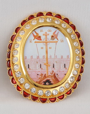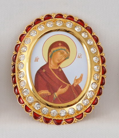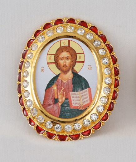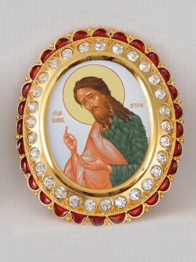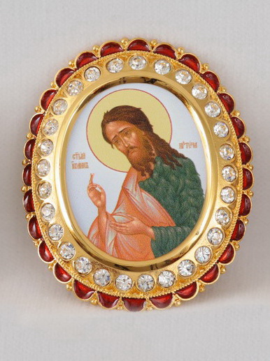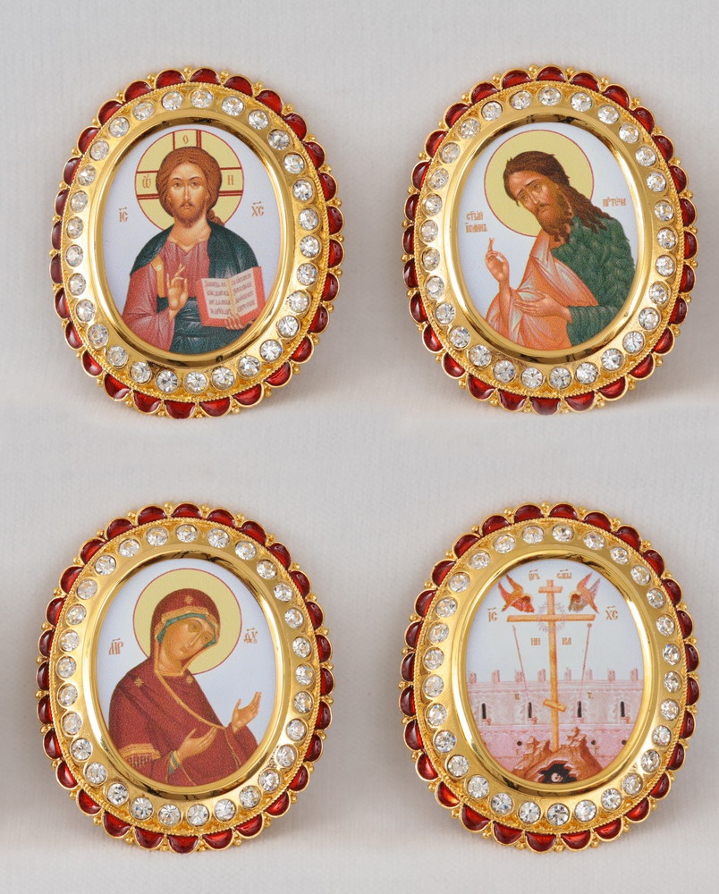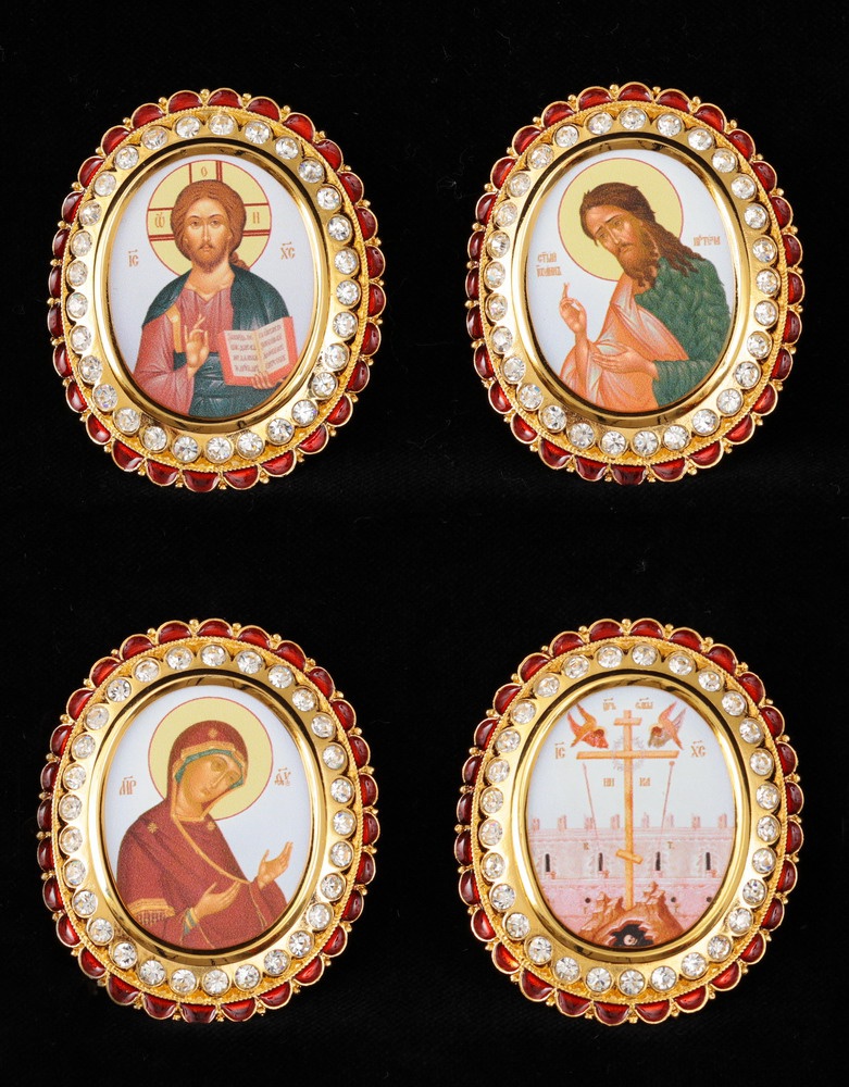 Цена указана за 1 икону. В позолоченный комплект икон для митры входят лики Иисуса Христа, Богородицы, Иоанна Крестителя, а также изображение Креста Господня. Яркие иконы нанесены на латунь методом типографского изображения. По периметру овальные медальоны украшены камнями и красной эмалевой каймой.