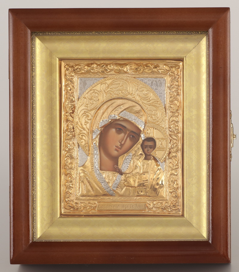Икона фото в киоте 11х13 риза №11 золоченая, багетный подрамник Казанская БМ
