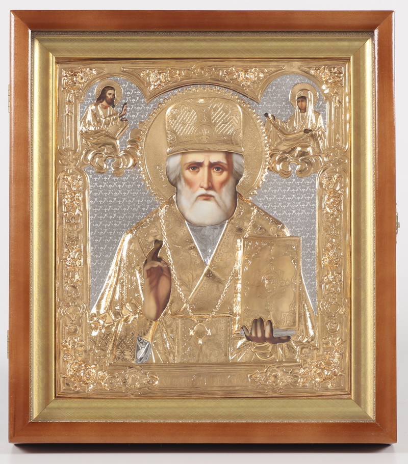 Икона фото в киоте 24х30 риза №111 золочёная, багетный подрамник Николай Чудотворец