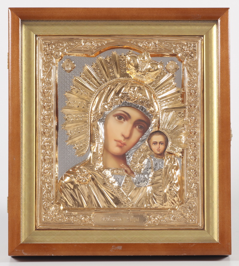 Икона фото в киоте 24х30 риза №193 золочёная, багетный подрамник Казанская БМ