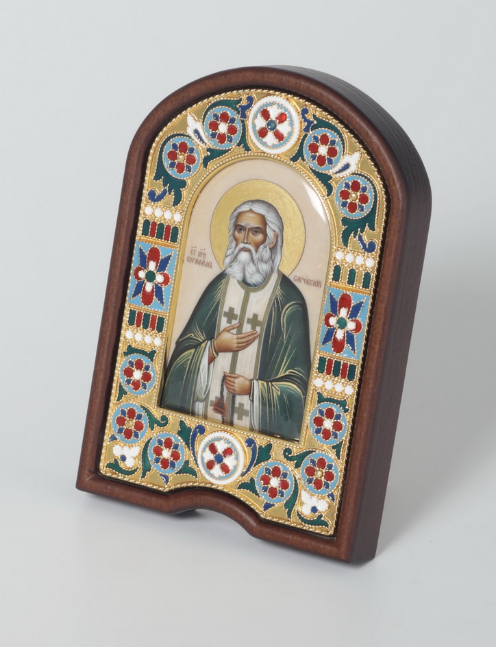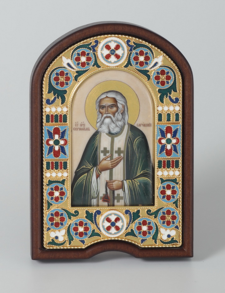 Икона именная №2 гальванопластика, эмаль, деколь, в деревянной рамке / золочение, электрофорез / Серафим Саровский
